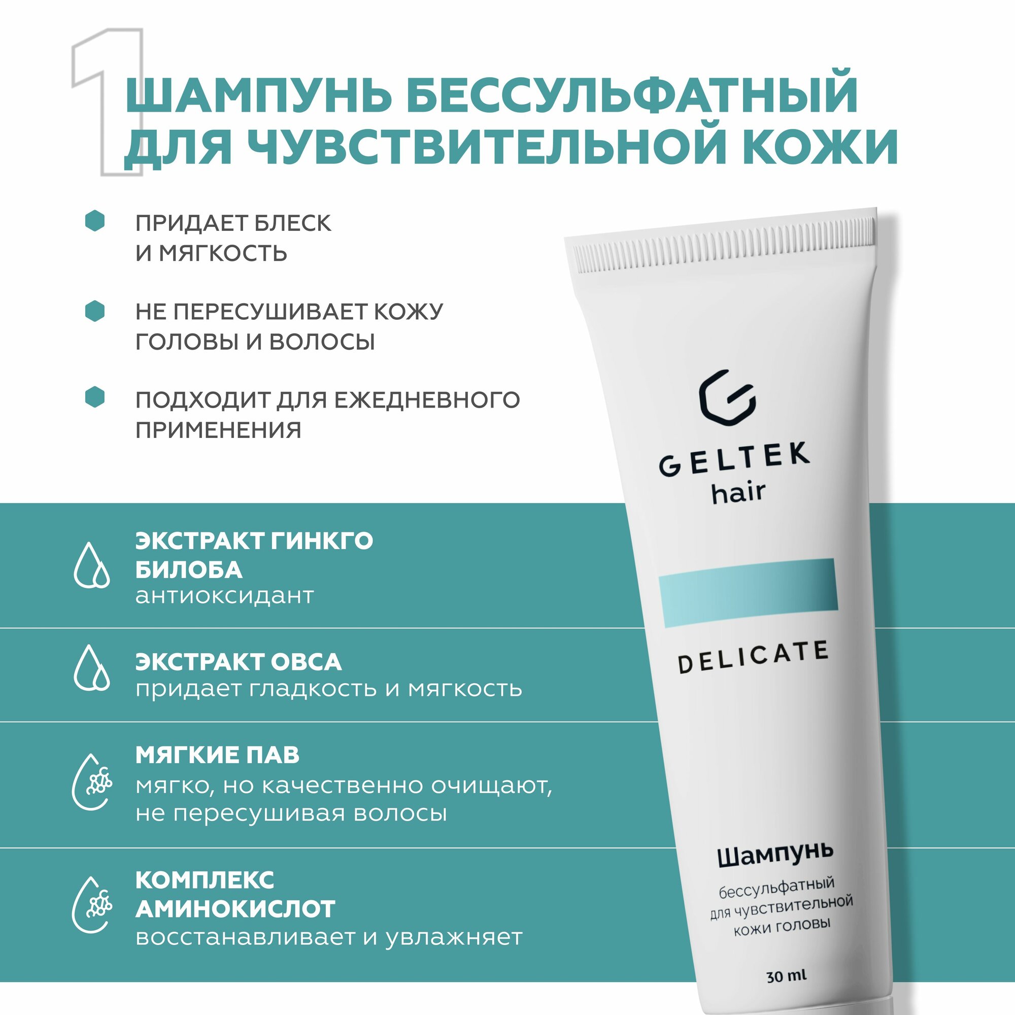 Гельтек Набор шампунь бессульфатный для чувствительной кожи головы и бальзам для поврежденных волос, 2 шт по 30 мл