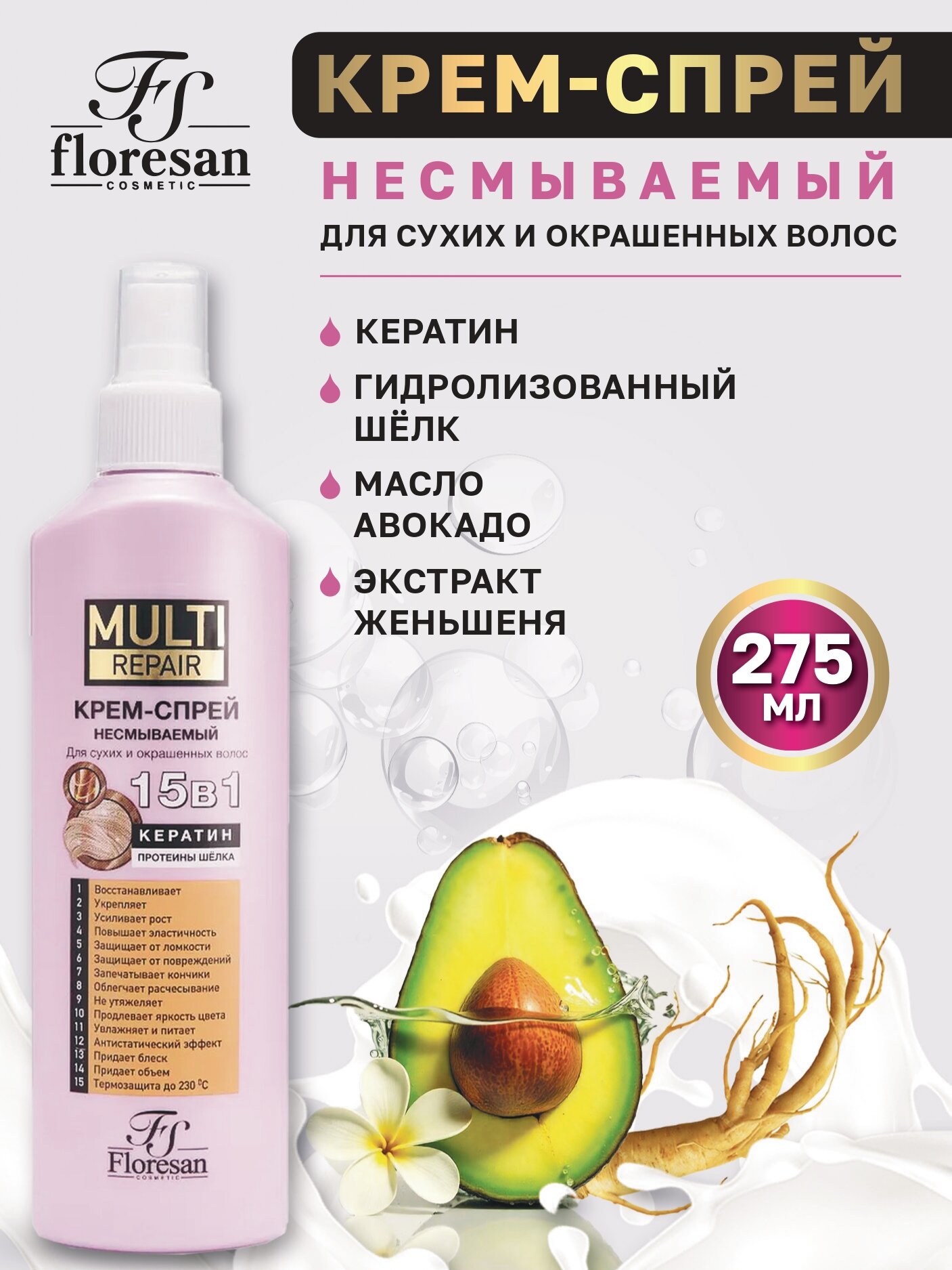 Floresan Крем-спрей для волос несмываемый 15 в 1 кератин MULTI repair 275 мл. интересное:
