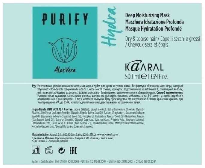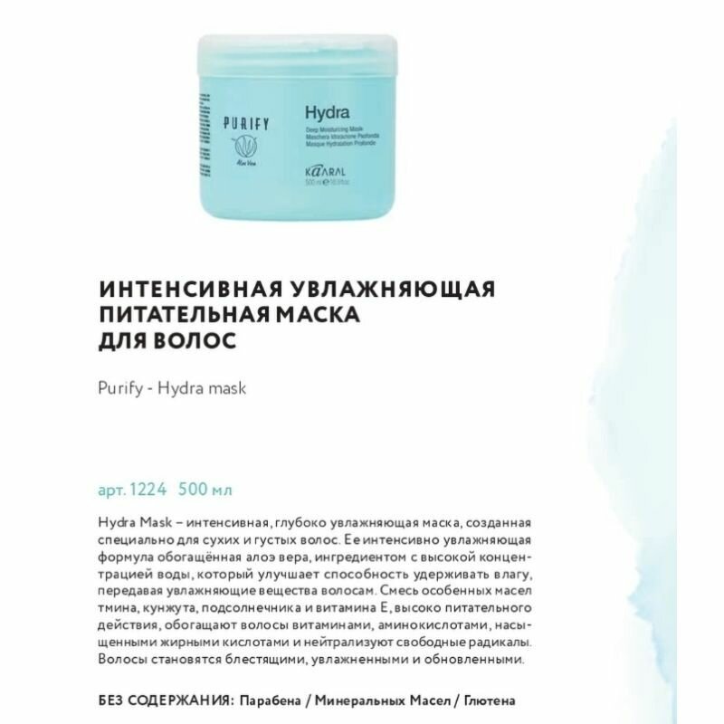 Kaaral Purify Hydra Набор 2-х Интенсивных масок для сухих и густых волос увлажняющая, питательная, 500 мл +500мл интересное: