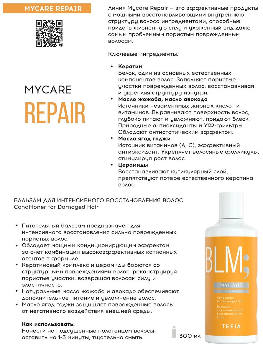 Tefia бальзам MyCare Repair для интенсивного восстановления поврежденных волос, 300 мл интересное:
