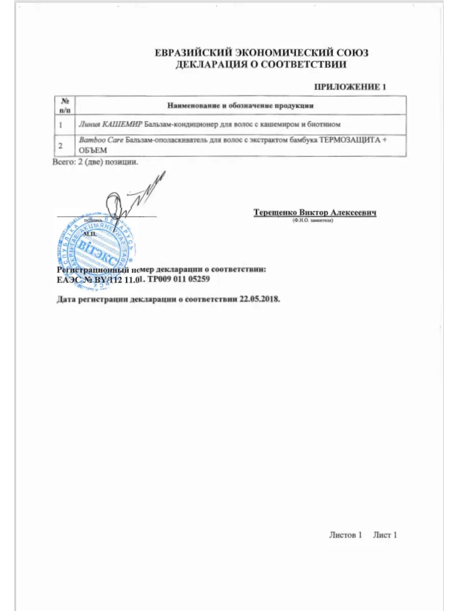 Бальзам-кондиционер для волос Белита-Витекс С кашемиром и биотином, для восстановления, 450 мл