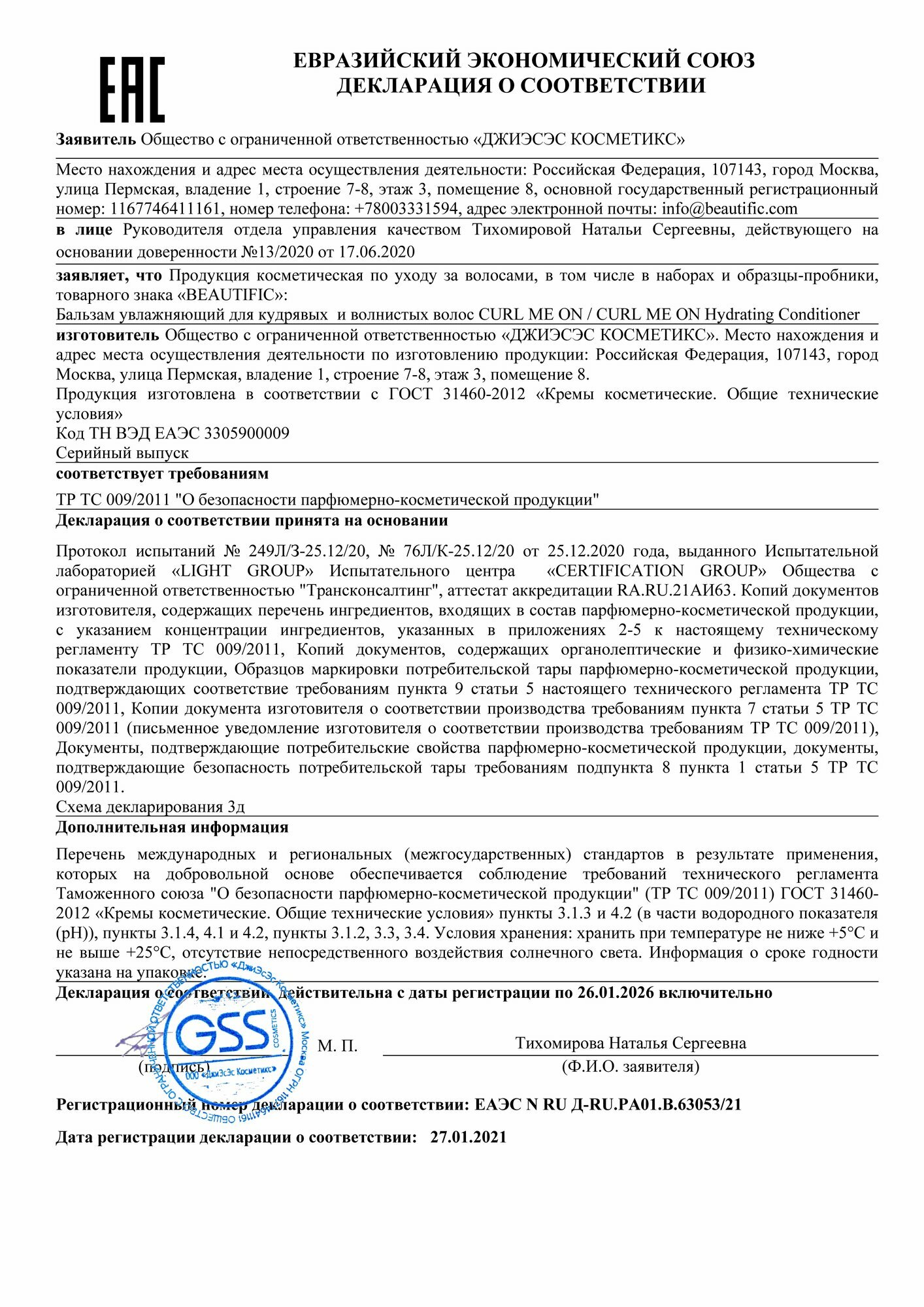 BEAUTIFIC Бальзам для кудрявых и вьющихся волос CURL ME ON увлажняющий, 250 мл интересное: