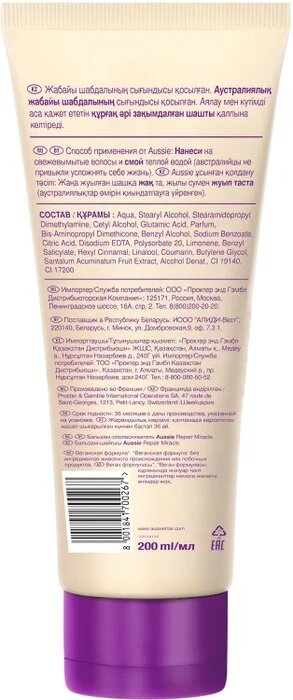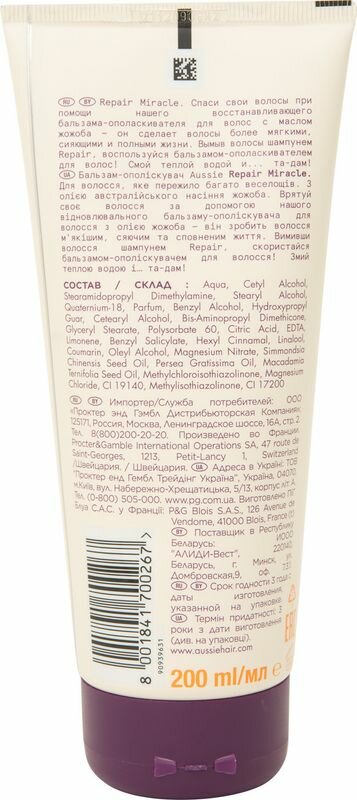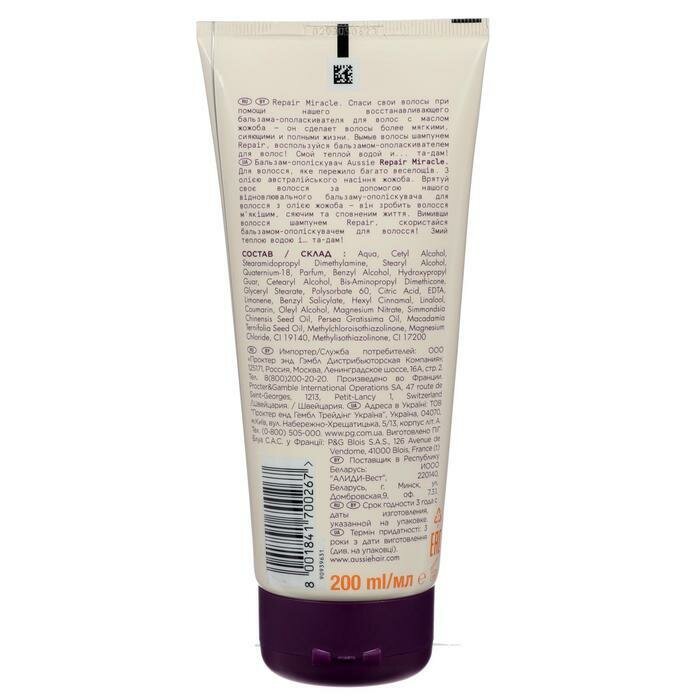 AUSSIE Бальзам-ополаскиватель Repair Miracle с маслом семян жожоба для поврежденных волос / Осси / 200 мл, интересное: