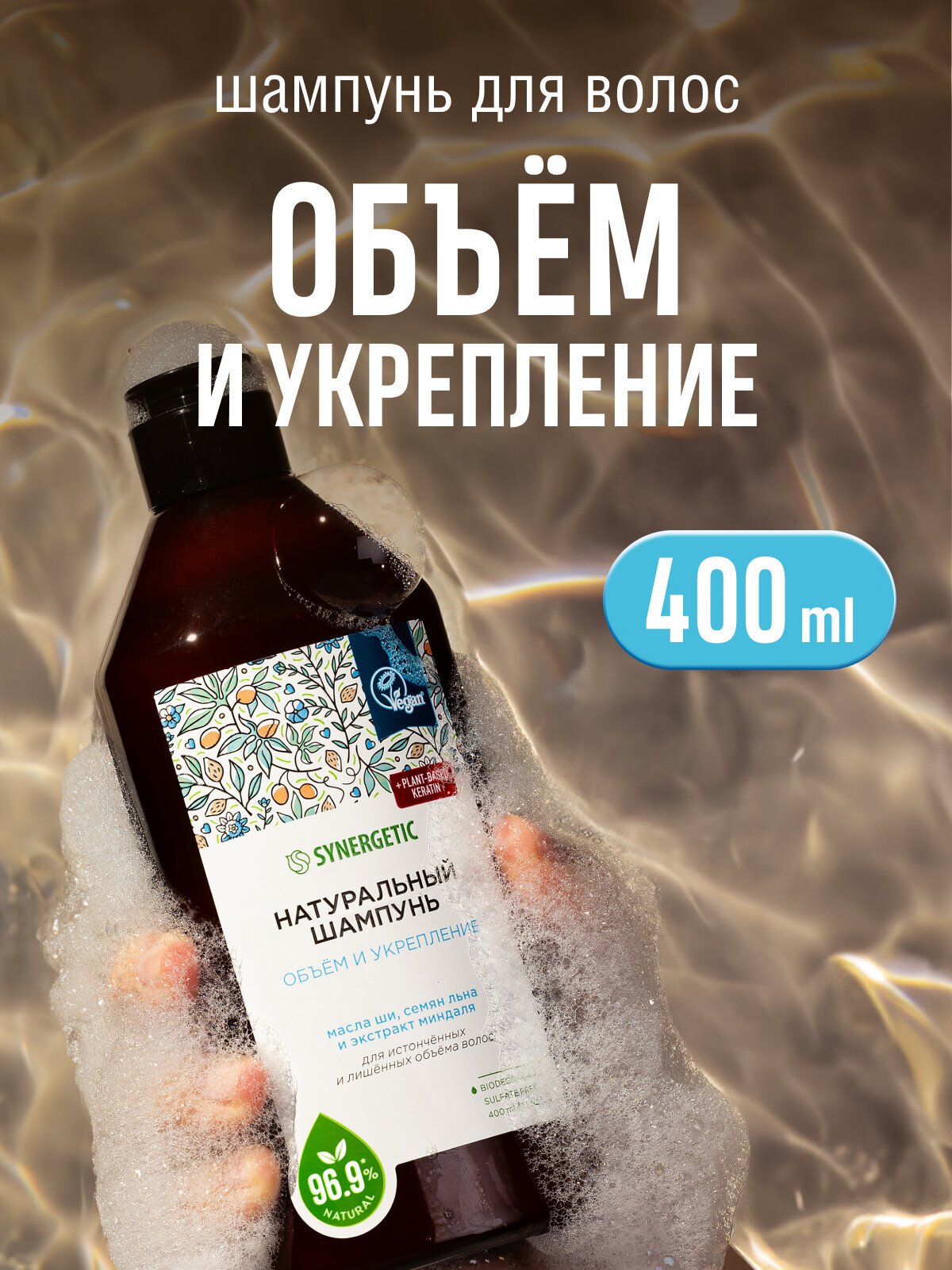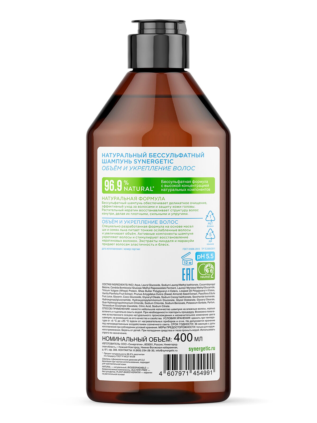 Купить Натуральный бессульфатный шампунь SYNERGETIC Объём и укрепление волос 400 мл