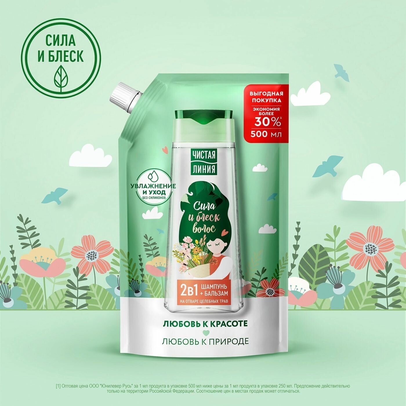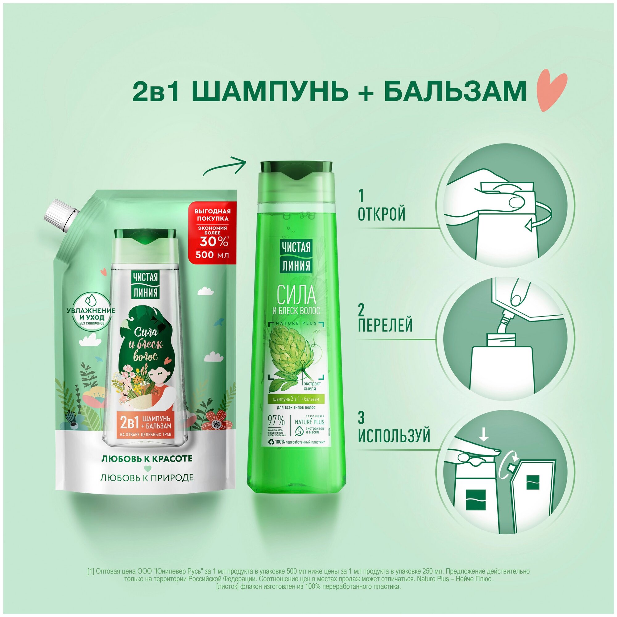 Купить Чистая Линия шампунь+бальзам 2в1 Сила и блеск волос на отваре целебных трав, без силиконов 500 мл