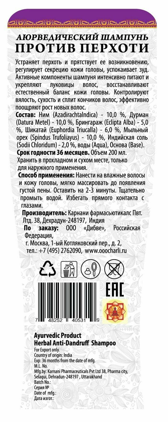 Аюрведический шампунь 'Против перхоти с Ним, Дурман, Брингарадж', 200 мл, Индия
