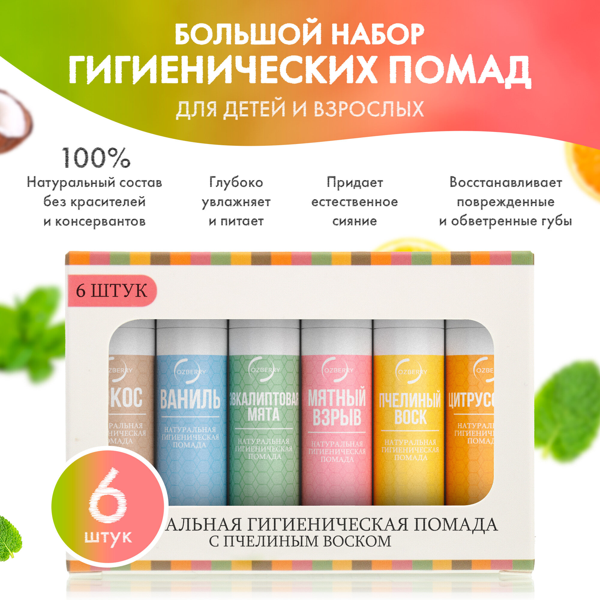 Купить Натуральный бальзам для губ с пчелиным воском OZBERRY. 6 шт. Гигиеническая помада, подарочный набор