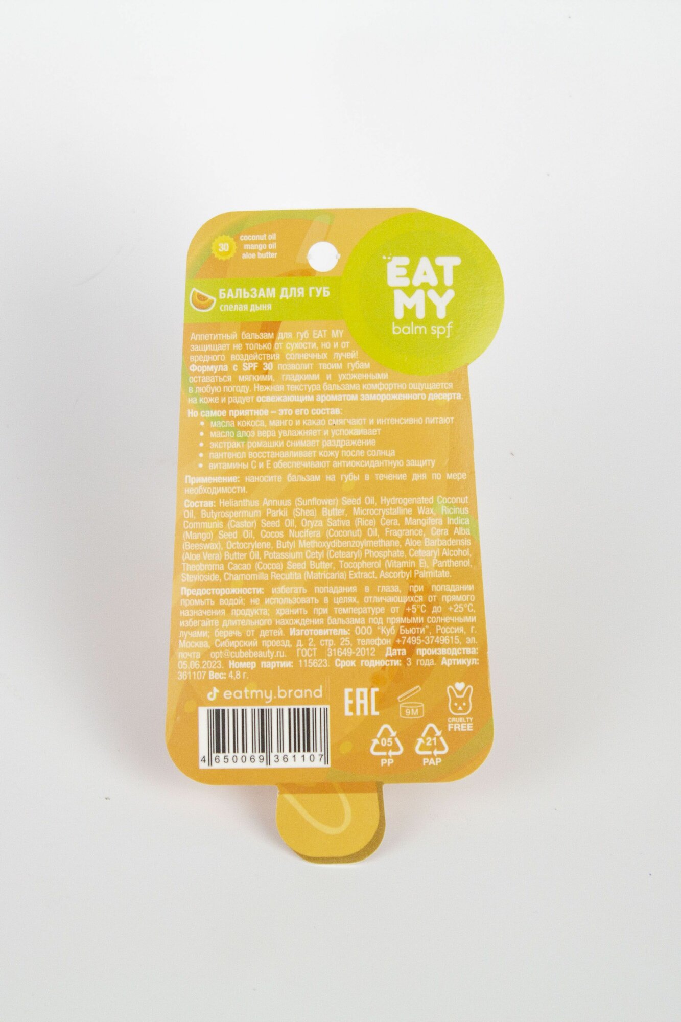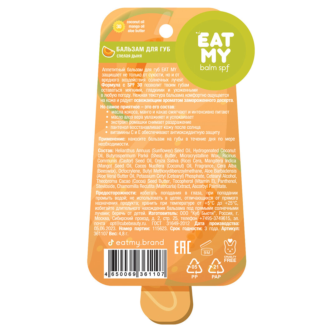 СохранитьEAT MY Бальзам для губ c SPF 30 "Спелая дыня" 4,8 г интересное: