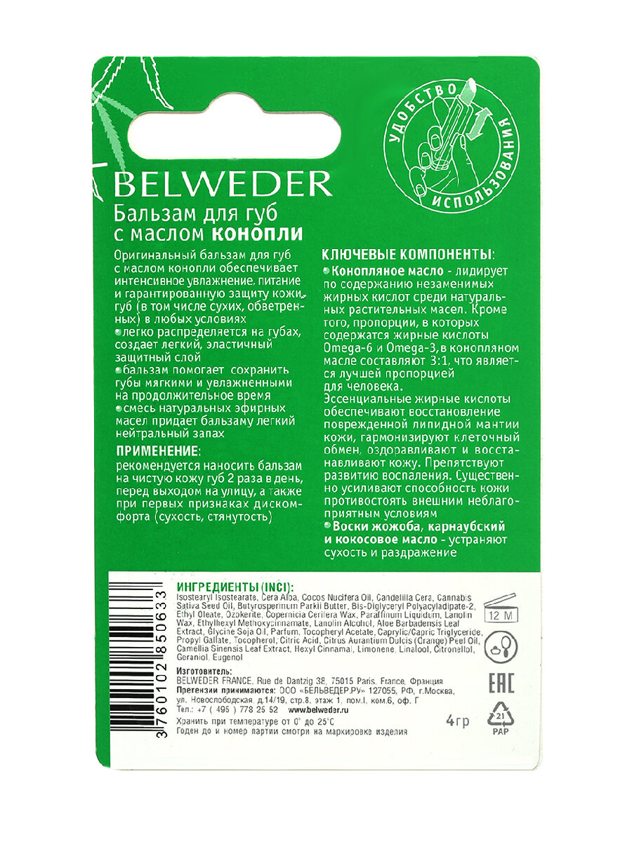 Бальзам для губ с маслом конопли Belweder глубоко увлажняющий интересное: