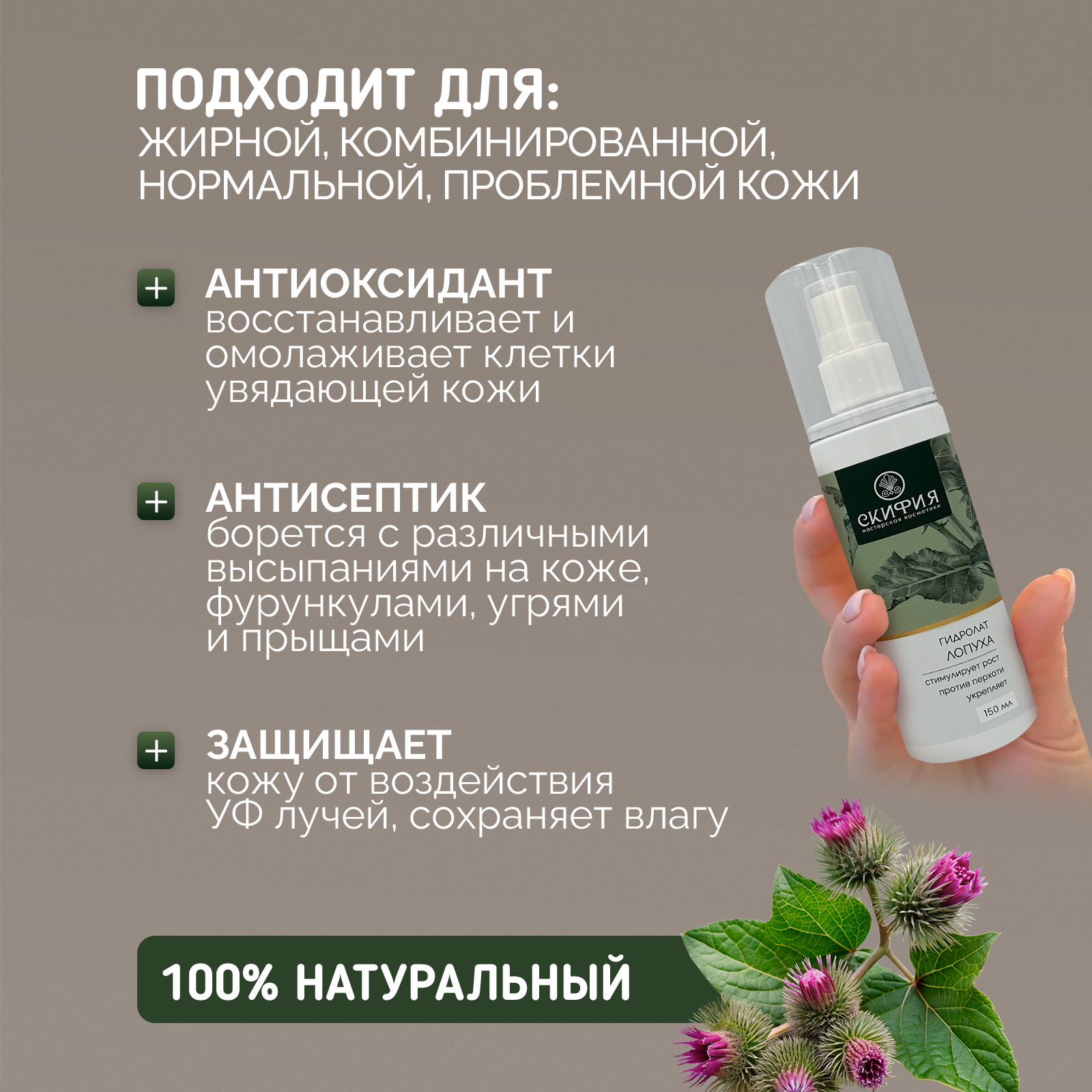 Купить Гидролат лопуха натуральный для волос Скифия, 150 мл
