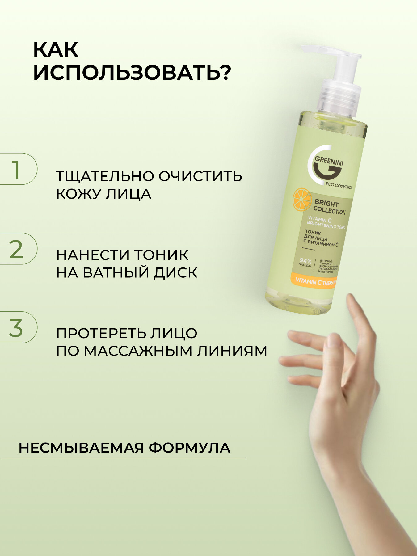 Greenini Тоник для лица с витамином С осветляющий Освежение и очищение кожи 94% Natural 200мл интересное: