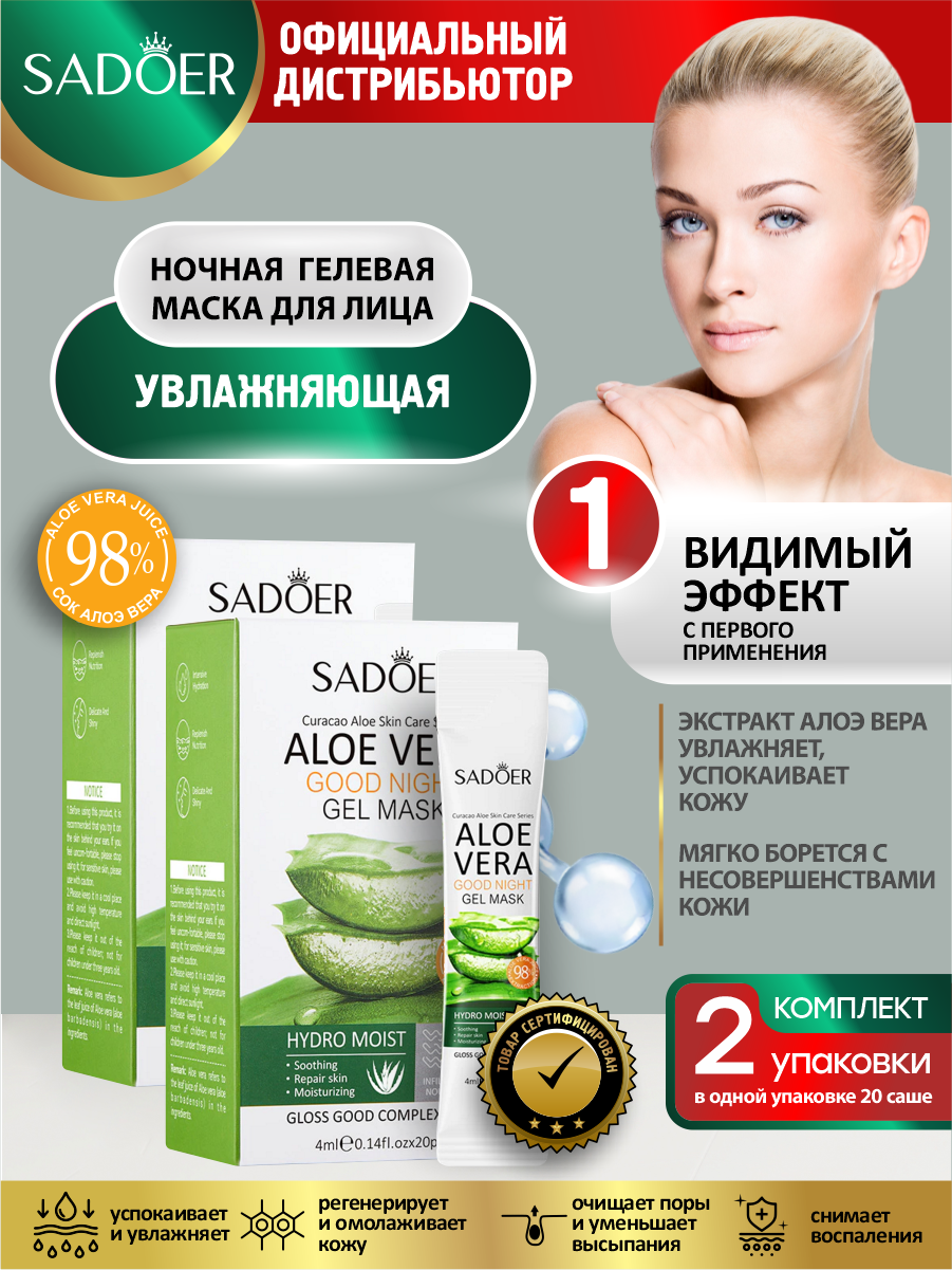 Купить Увлажняющая гелевая ночная маска для лица Sadoer с соком алоэ вера 20 шт. по 4 мл. х 2 уп.