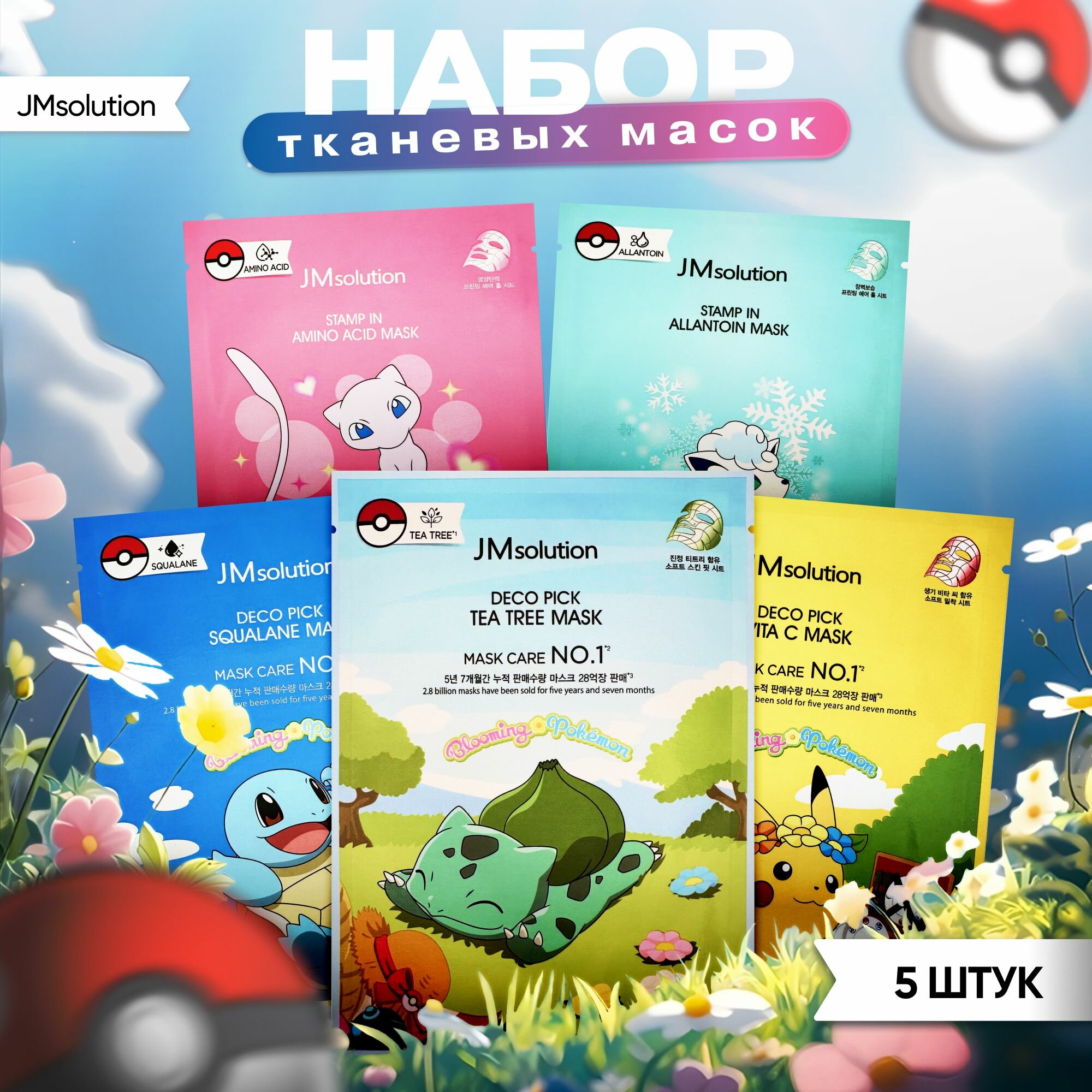 JMSolution Набор тканевых масок для комплексного ухода за кожей лица, полная коллекция DECO PICK POKEMON, 30мл.* 5 шт. интересное: