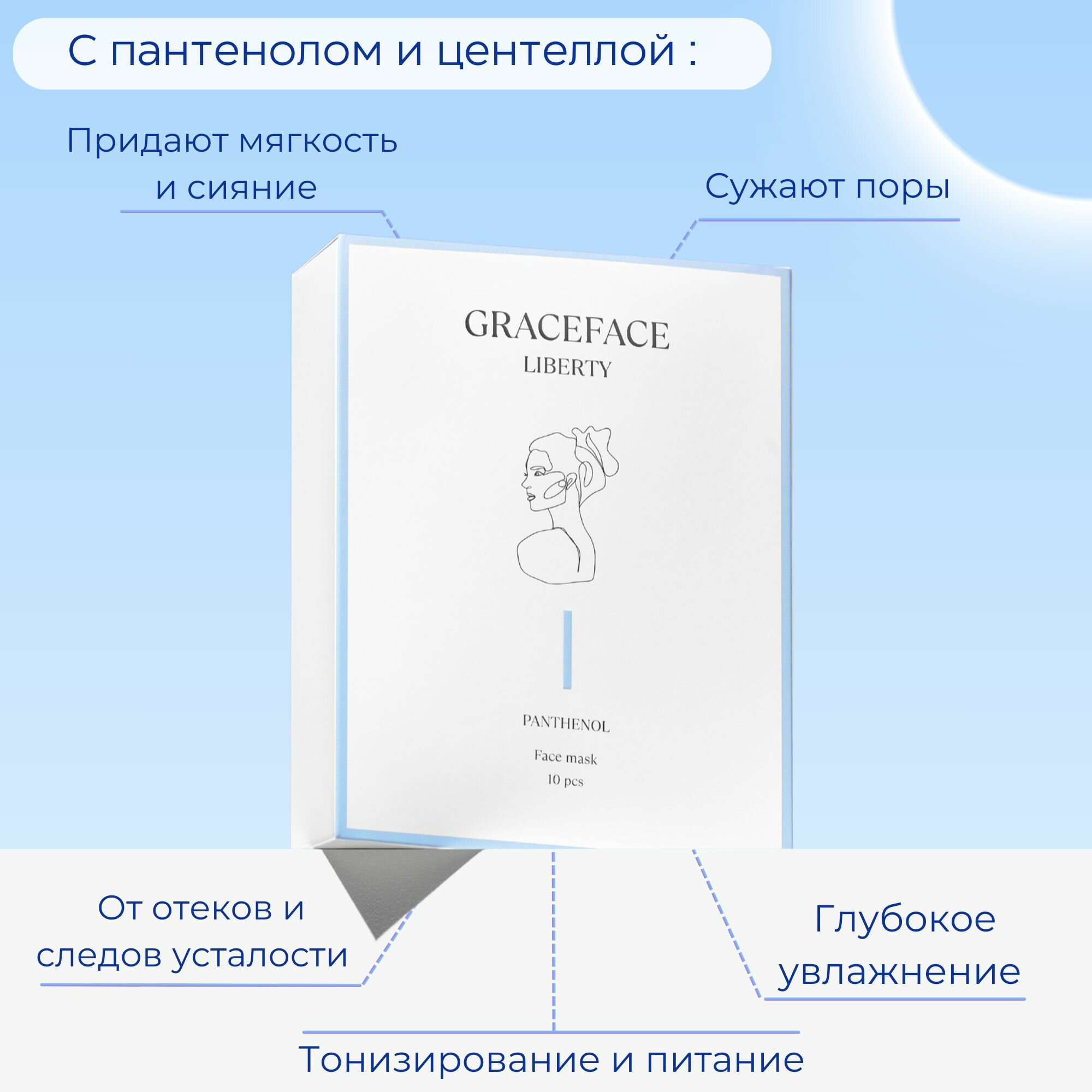Купить Набор тканевых масок для лица Grace FACE 10 шт*25 г в коробке с пантенолом и центеллой азиатской, гиалуроновой кислотой, увлажняющих
