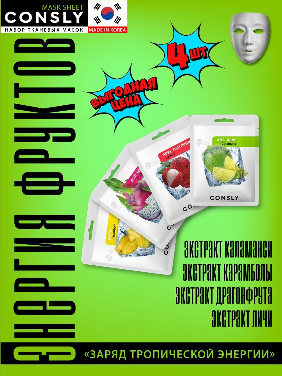 Купить Consly Заряд тропической энергии Подарочный набор тканевых масок для ухода за лицом, корейская косметика. 4 шт