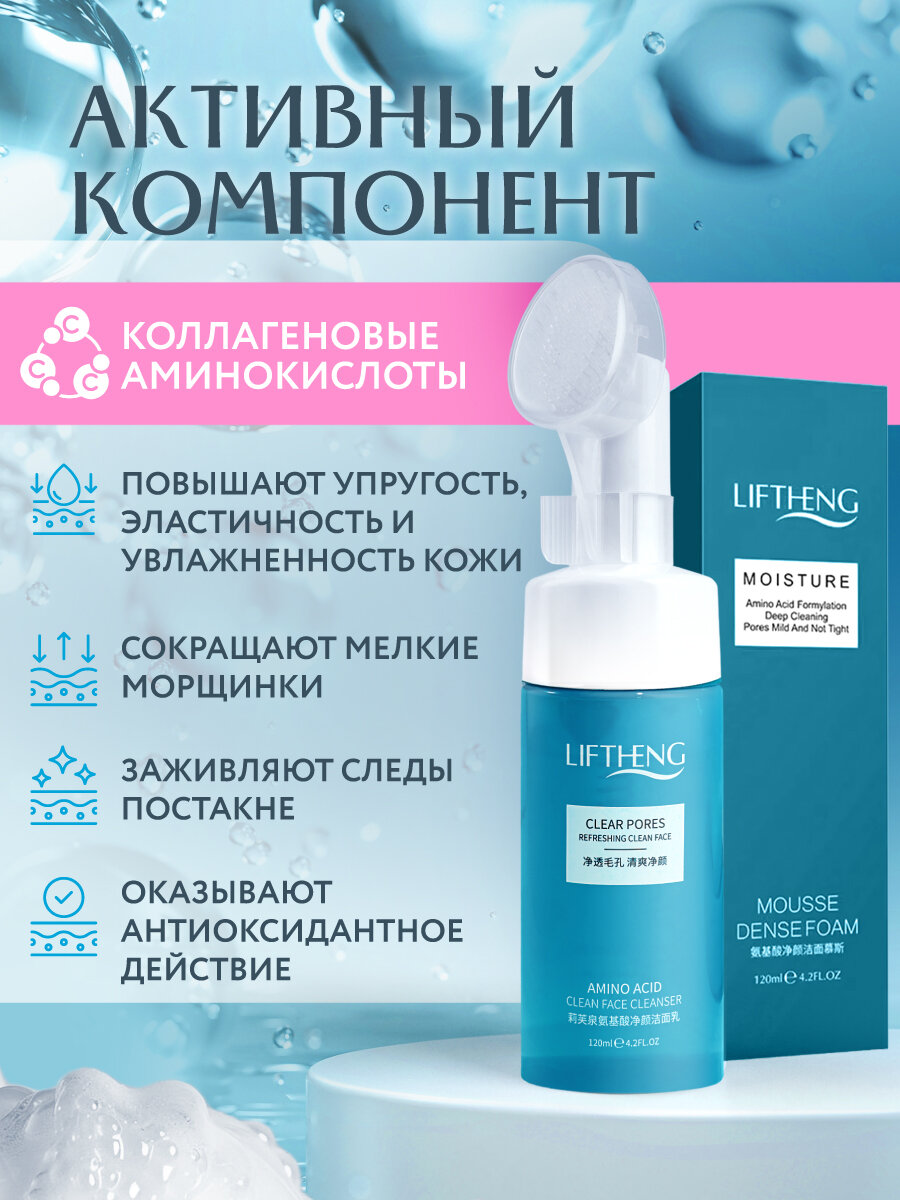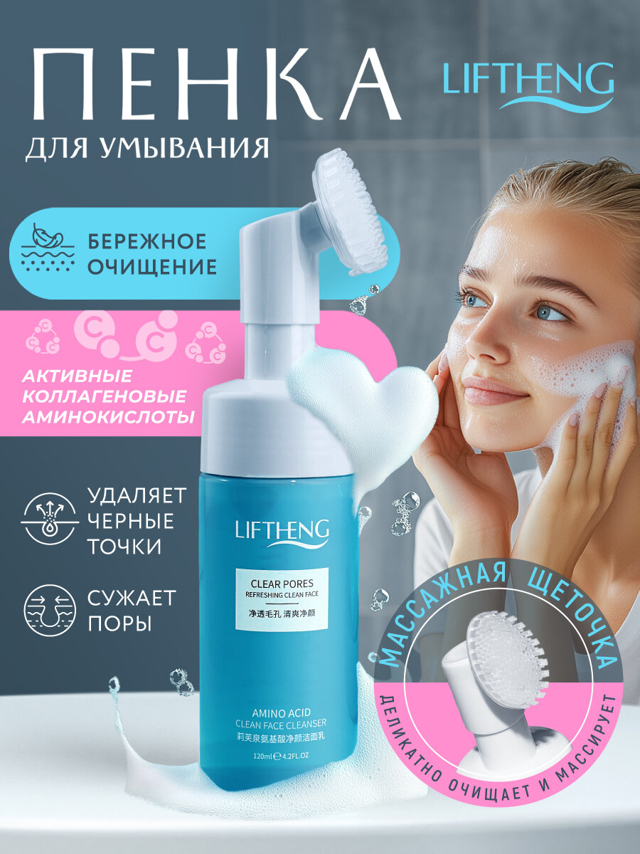 Пенка - мусс для умывания Liftheng с массажной щеточкой, 120мл / Очищающее средство для кожи лица с аминокислотами интересное: