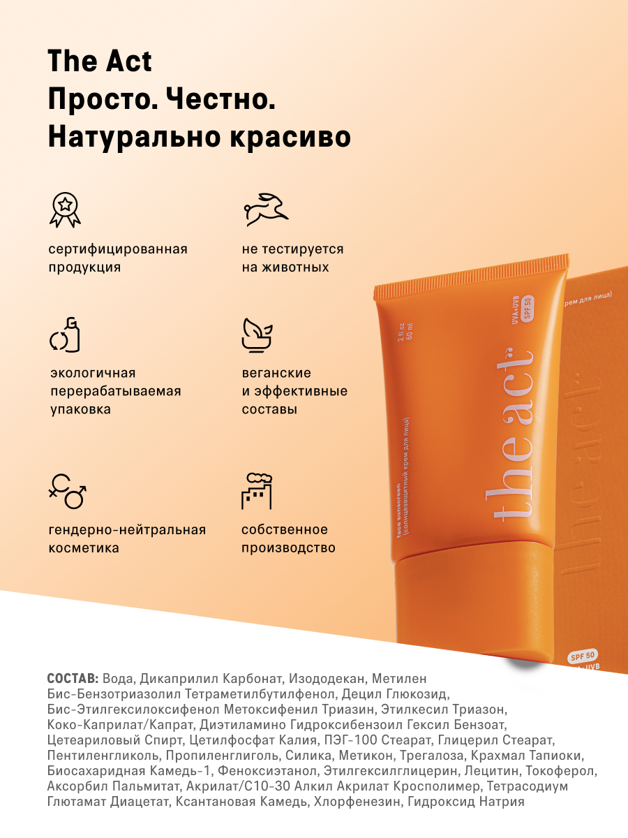 Солнцезащитный крем для лица SPF 50 The Act, легкий, без белых следов, 60 мл интересное: