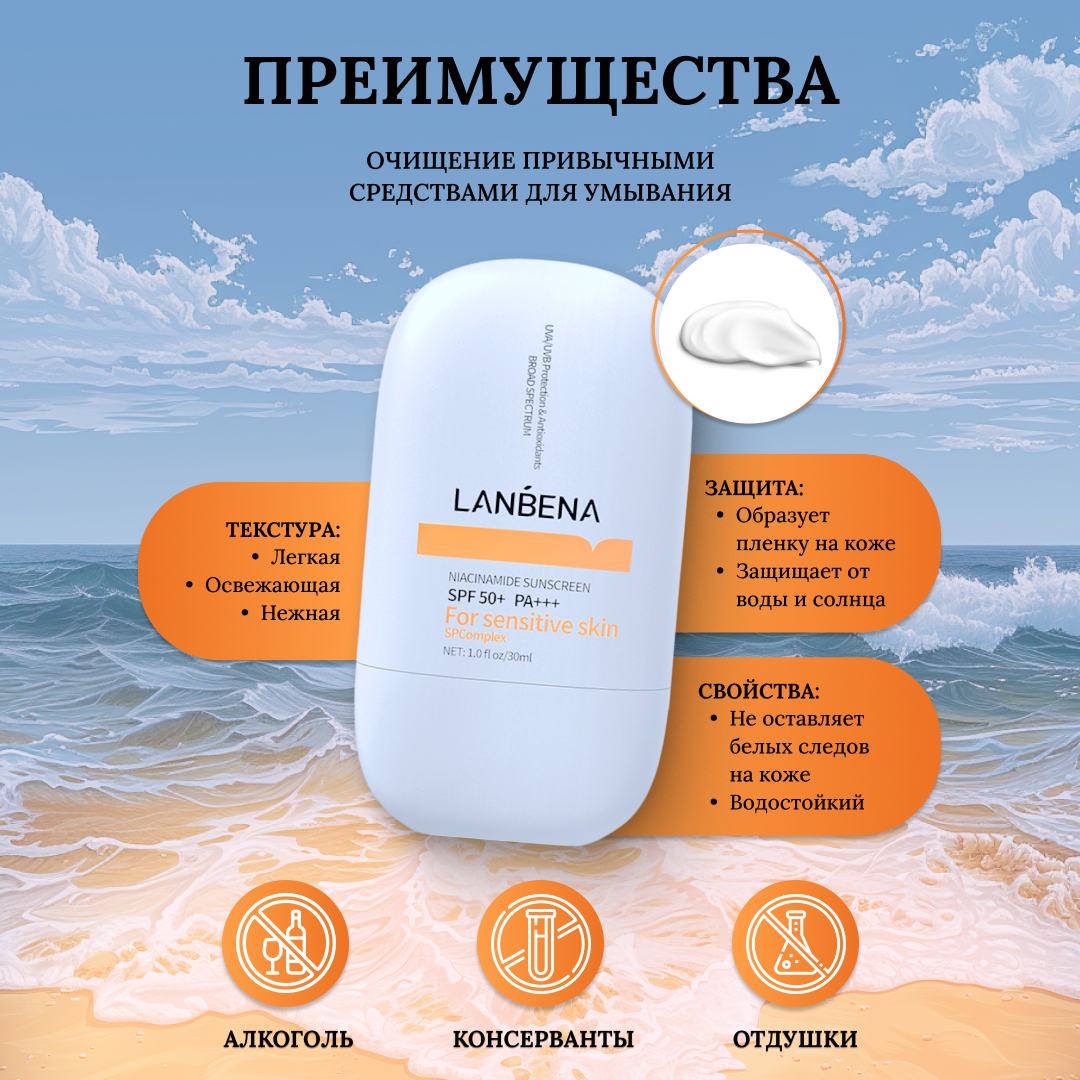 Солнцезащитный крем для лица увлажняющий 50 spf Lanbena с ниацинамидом, 30 мл интересное: