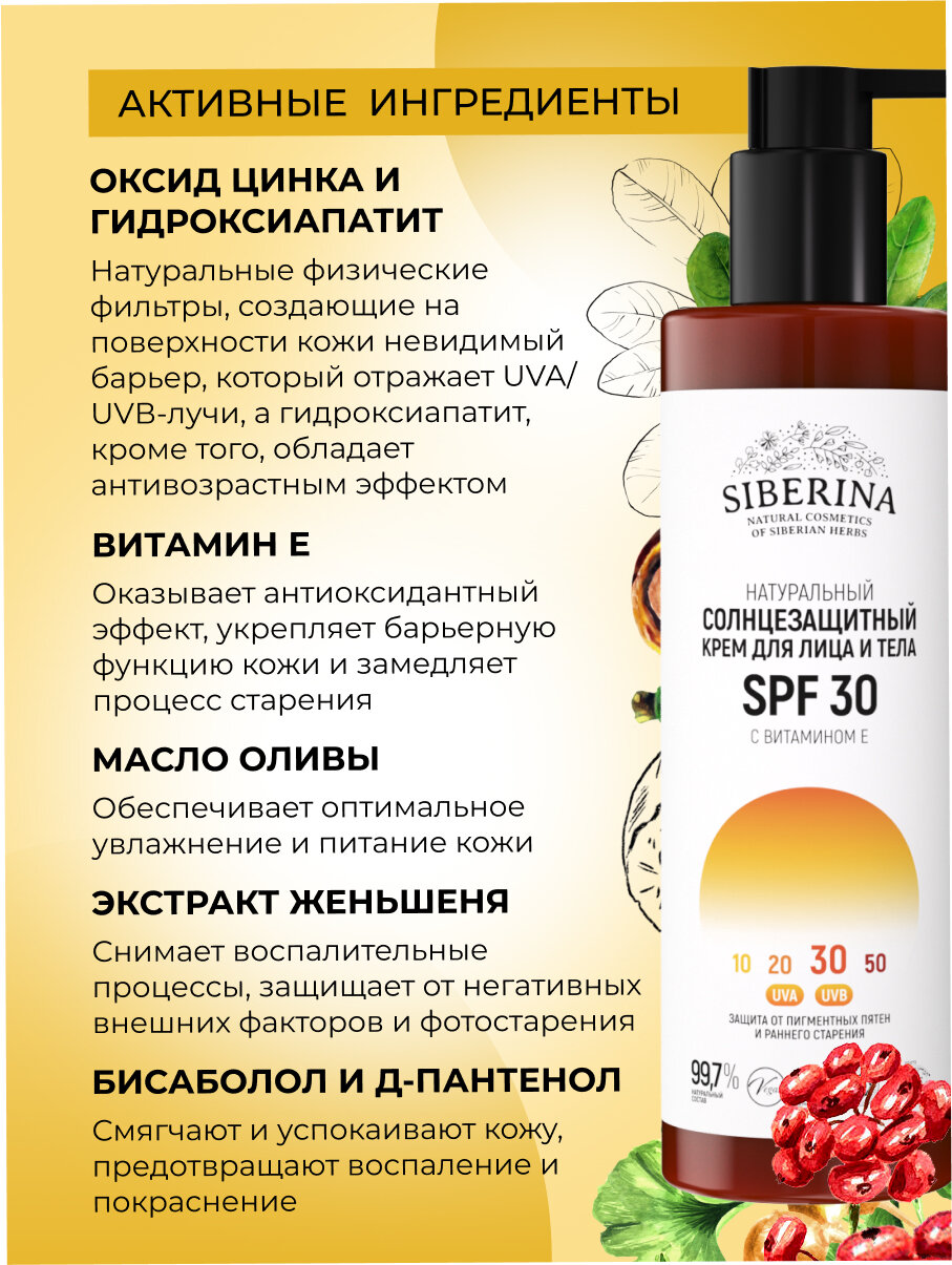 Siberina Натуральный солнцезащитный крем для лица и тела SPF 30 с витамином Е 200 мл интересное: