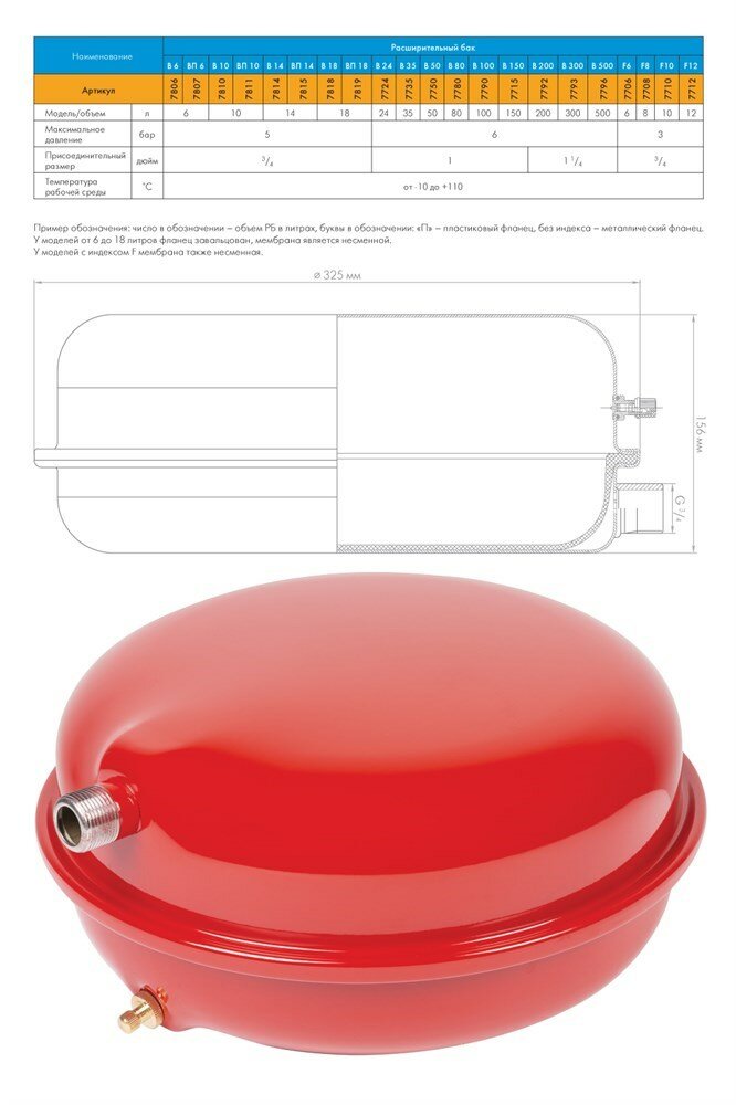 Расширительный мембранный бак 12 F, 3/4"НР, -10-110°С, 3 бар, Джилекс 7712