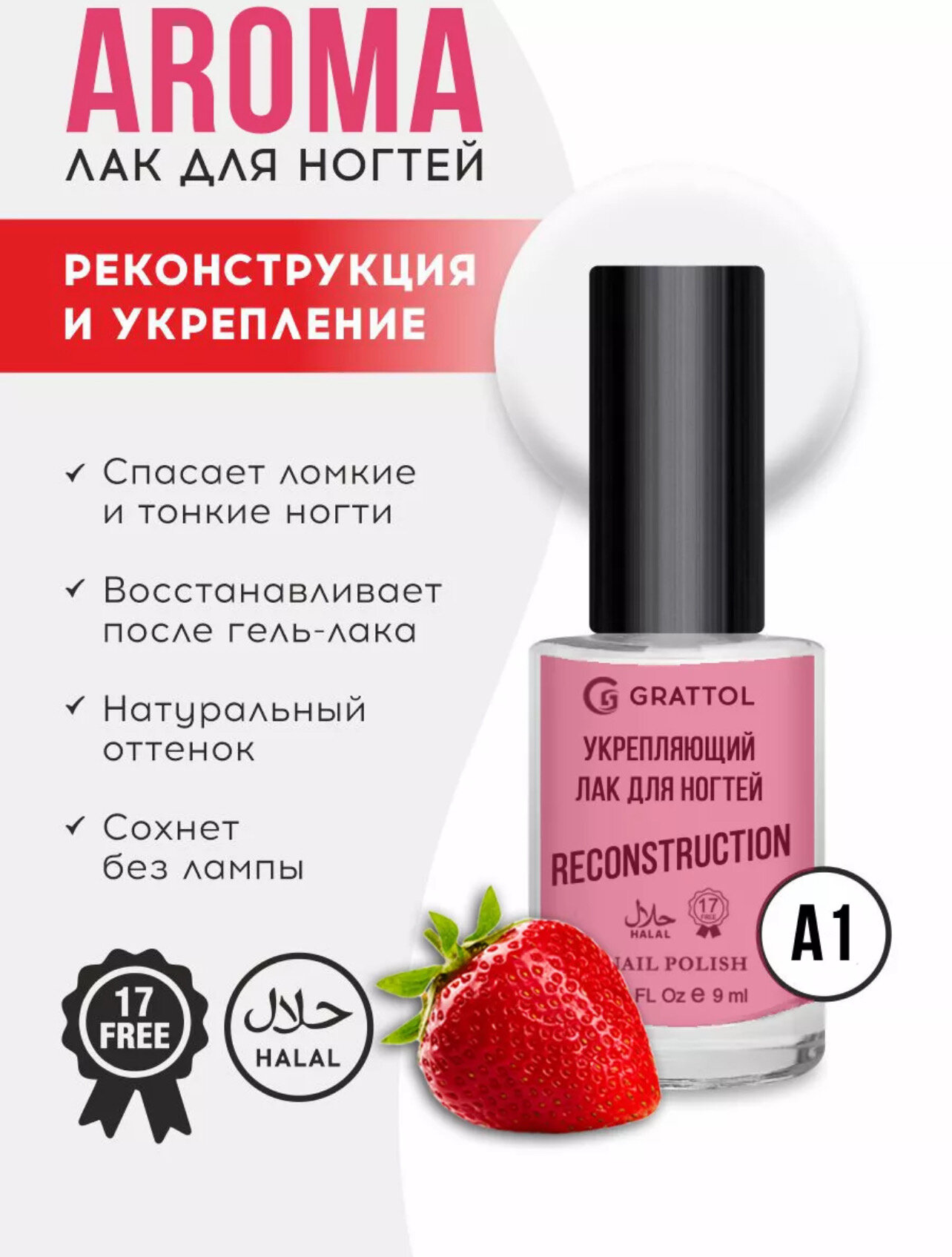 Grattol Aroma Strawberry - укрепляющий лак для ногтей с ароматом клубники, прозрачно-розовый, без лампы, Халяль, 9 мл интересное:
