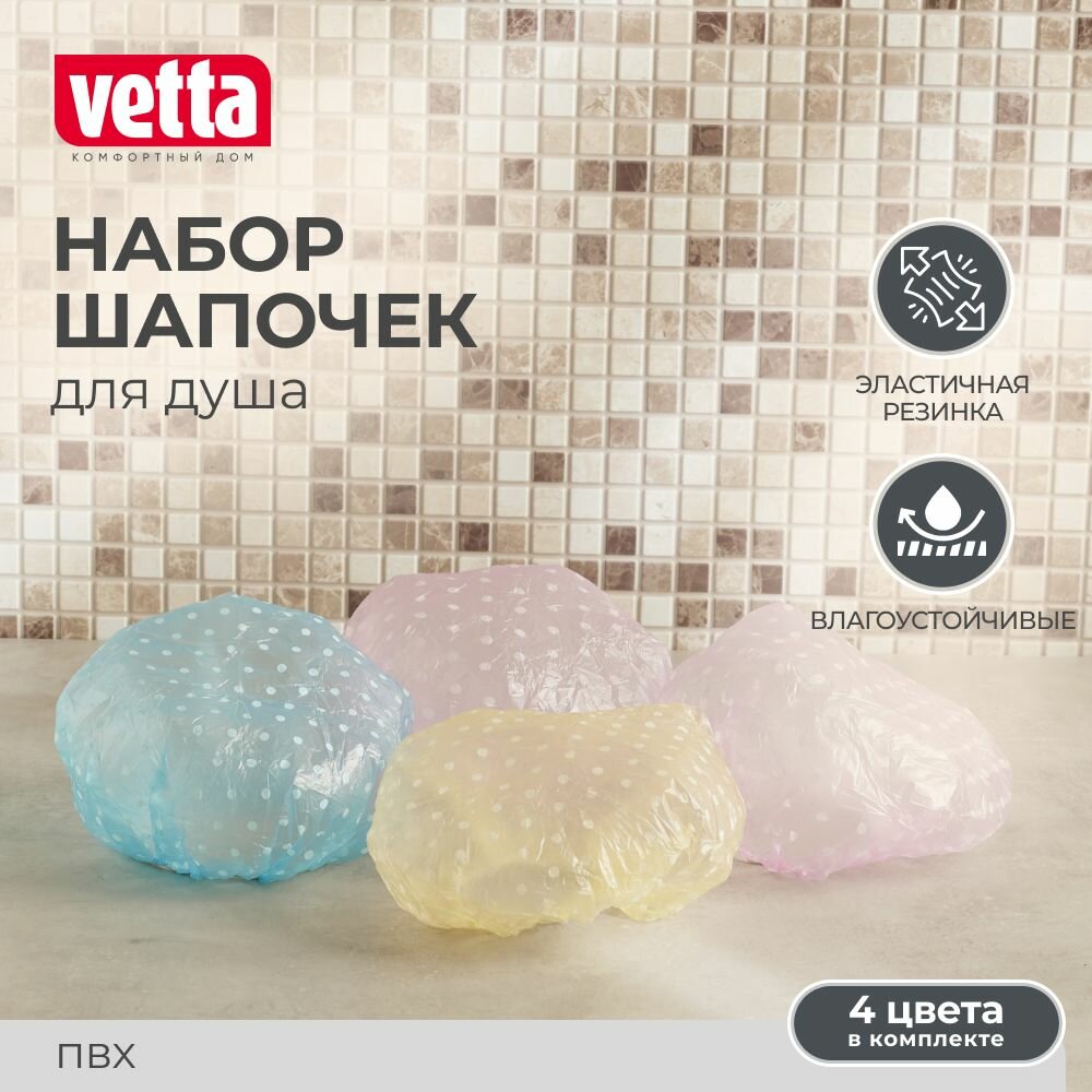 Купить Набор шапочек для душа 4шт VETTA, ПВХ, цветные