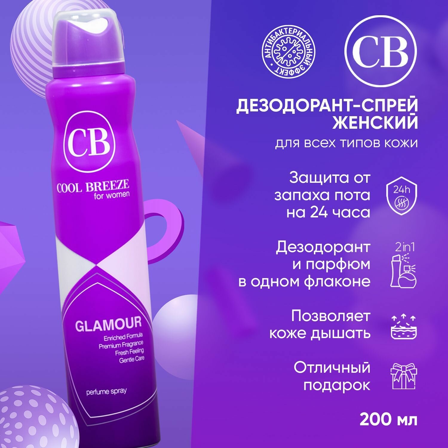 Дезодорант женский спортивный COOL BREEZE Glamour CB 200 мл Для спорта, парфюмированный фруктово-цветочный