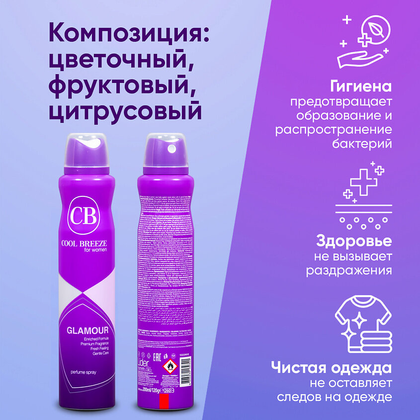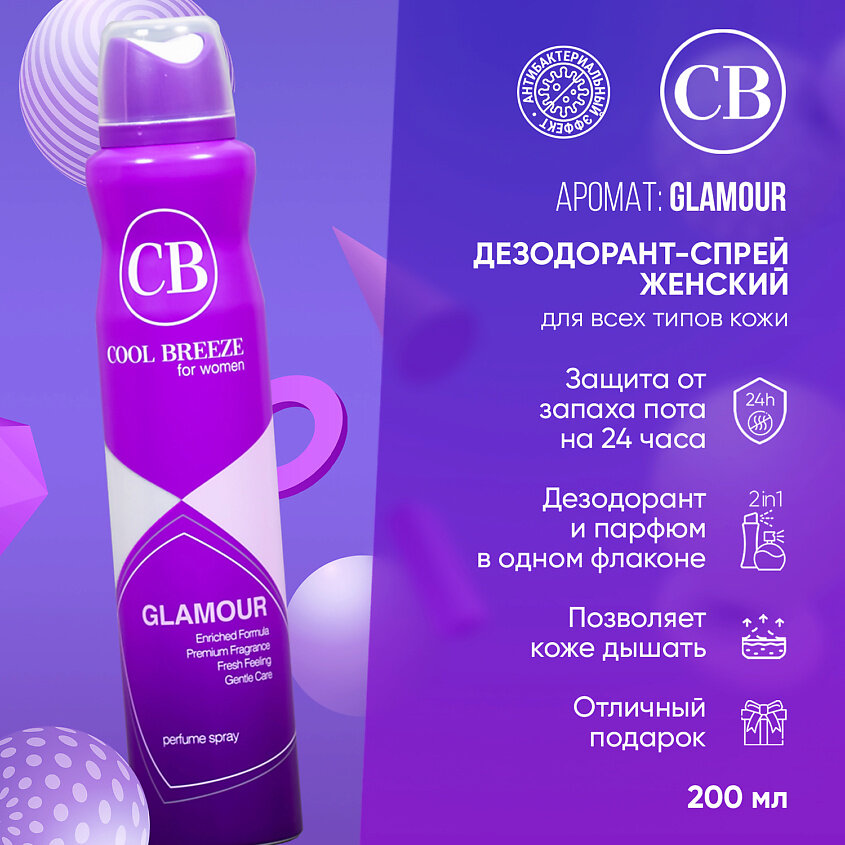 СохранитьДезодорант женский спортивный COOL BREEZE Glamour CB 200 мл Для спорта, парфюмированный фруктово-цветочный интересное: