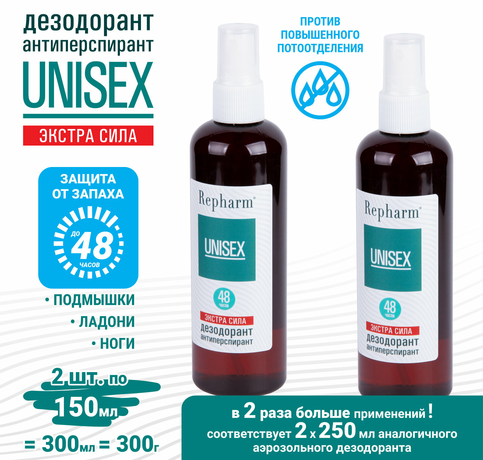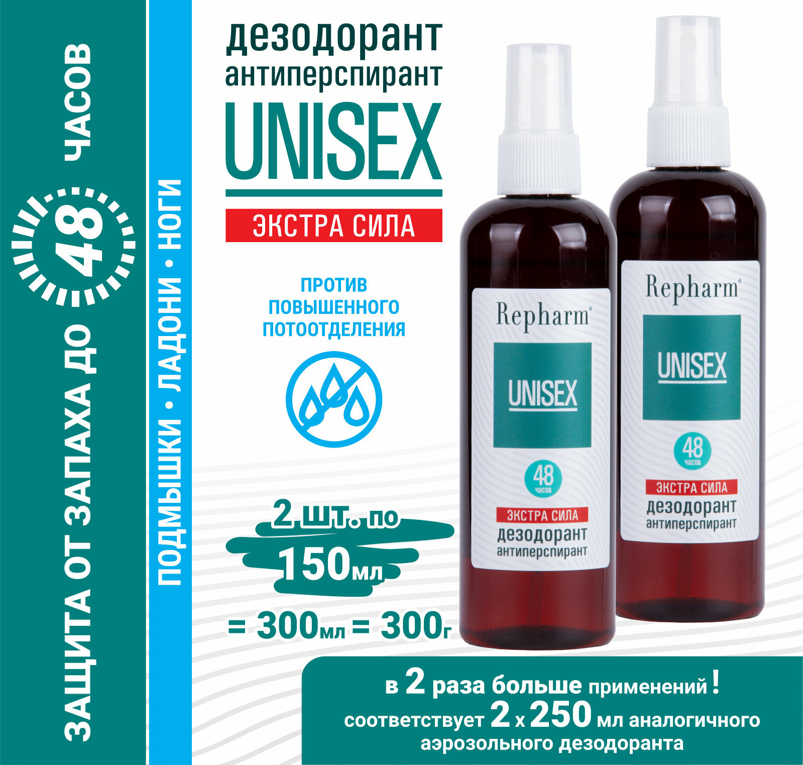 Дезодорант-антиперспирант Repharm Унисекс Экстра сила 150 мл - 2 шт женский мужской интересное: