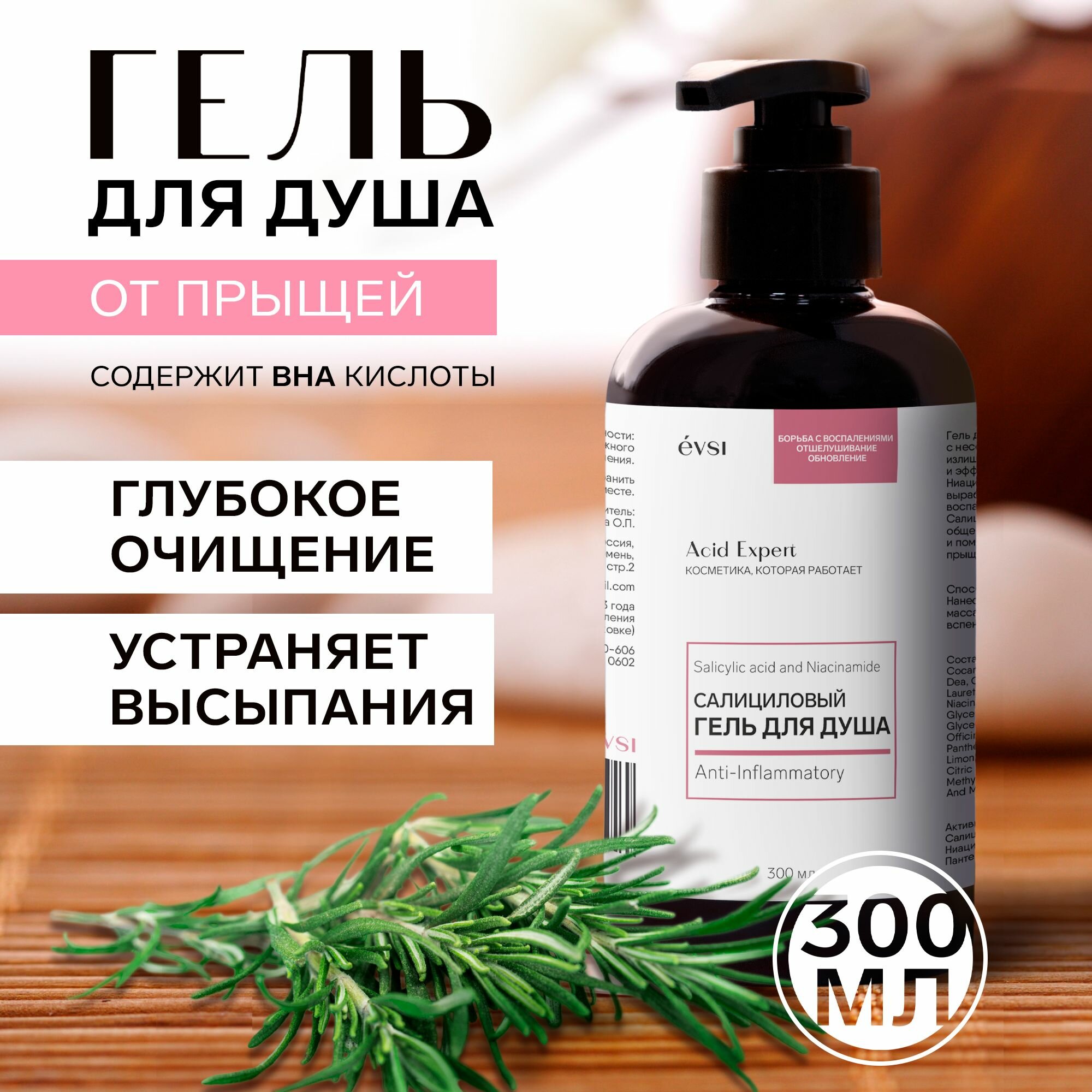 EVSI Гель для душа с кислотами от прыщей, черных точек, акне, Салициловая кислота, 300 мл интересное: