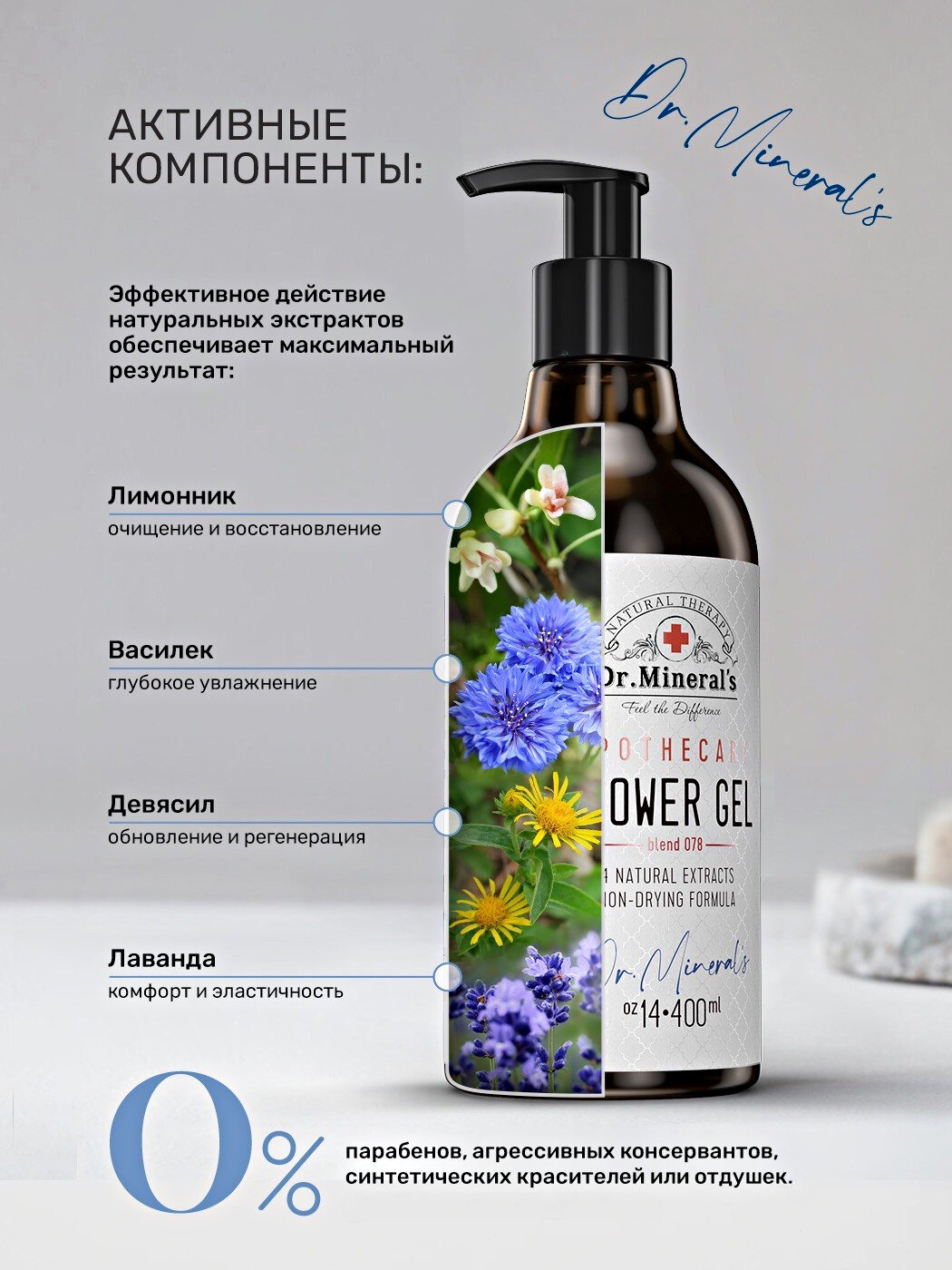 Dr. Mineral's, Натуральный гель для душа, бережное очищение и восстановление кожи, с экстрактами целебных растений, 400 мл