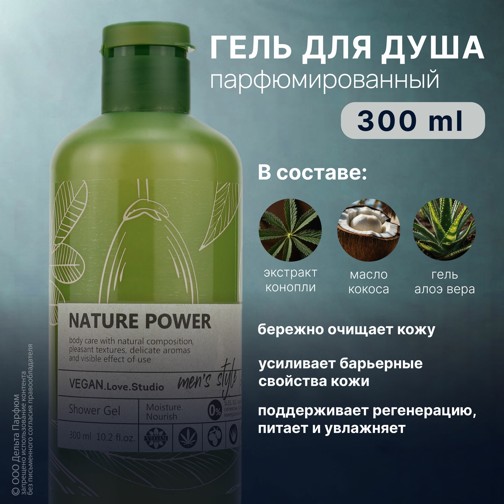 Гель для душа парфюмированный мужской VEGAN.Love.Studio NATURE POWER, 300 мл. масло кокоса, экстракт конопли, алоэ вера интересное: