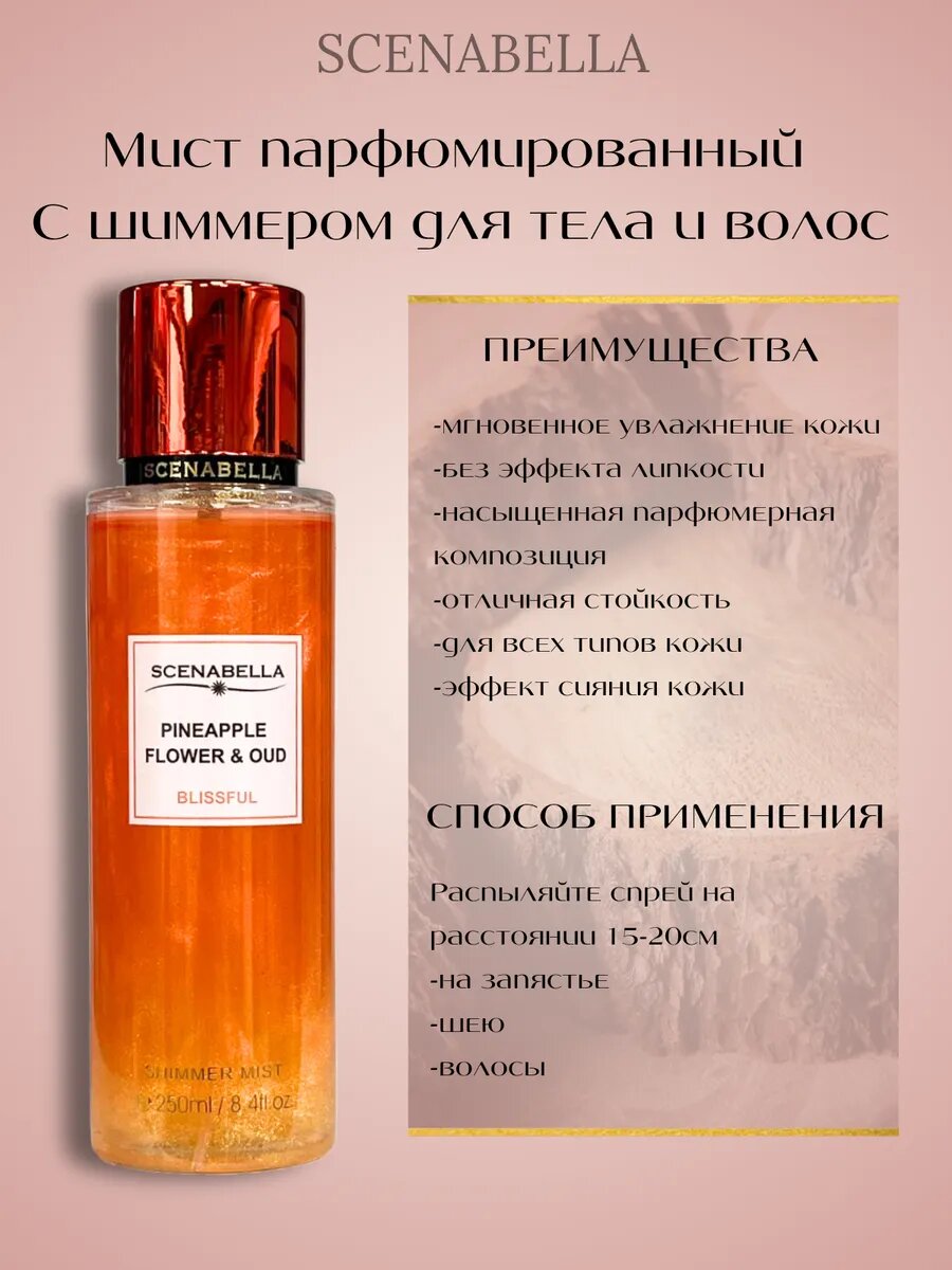 Scenabella Парфюмированный спрей мист для тела и волос с шиммером "Ананас и удовое дерево" 250мл