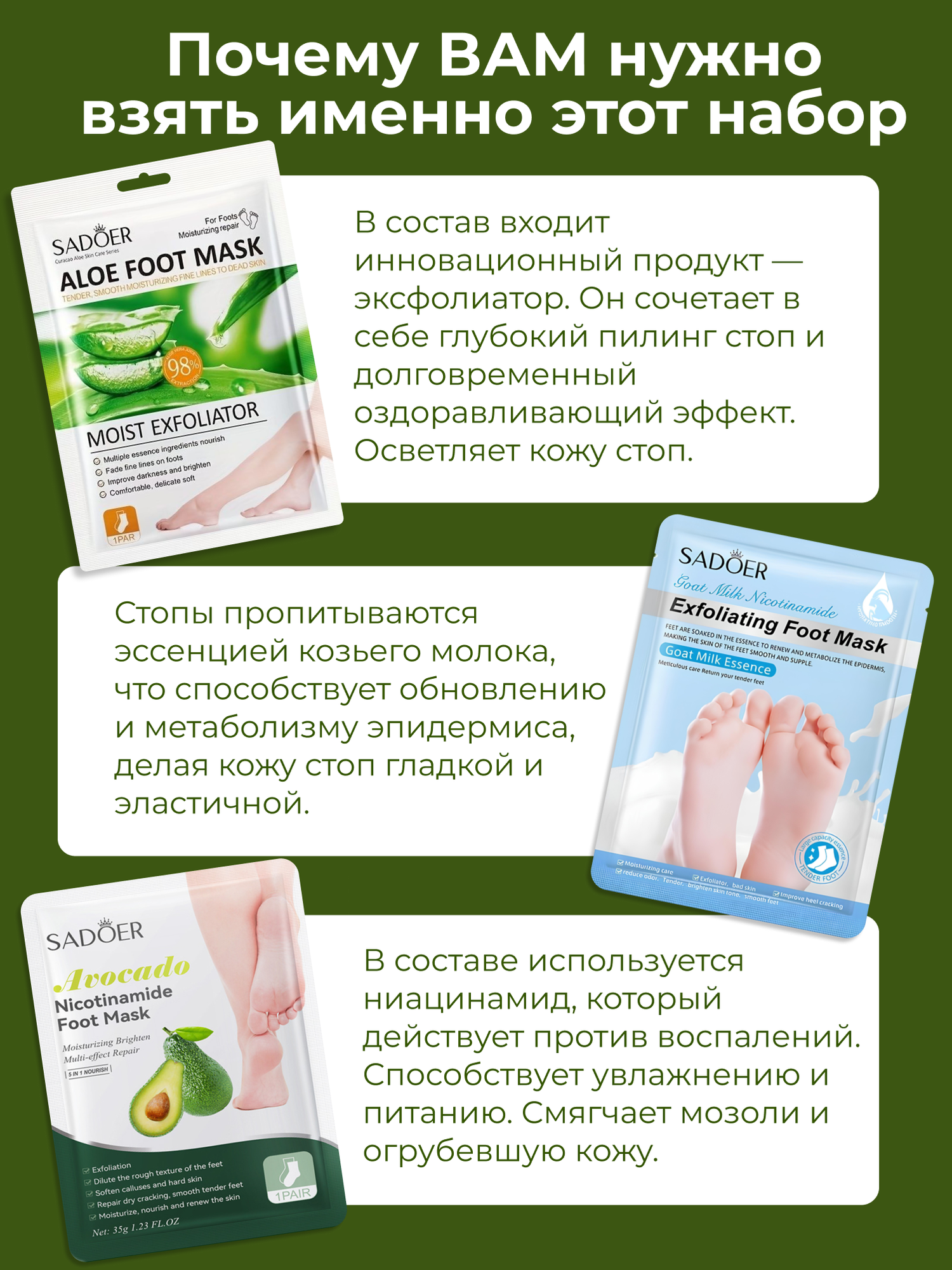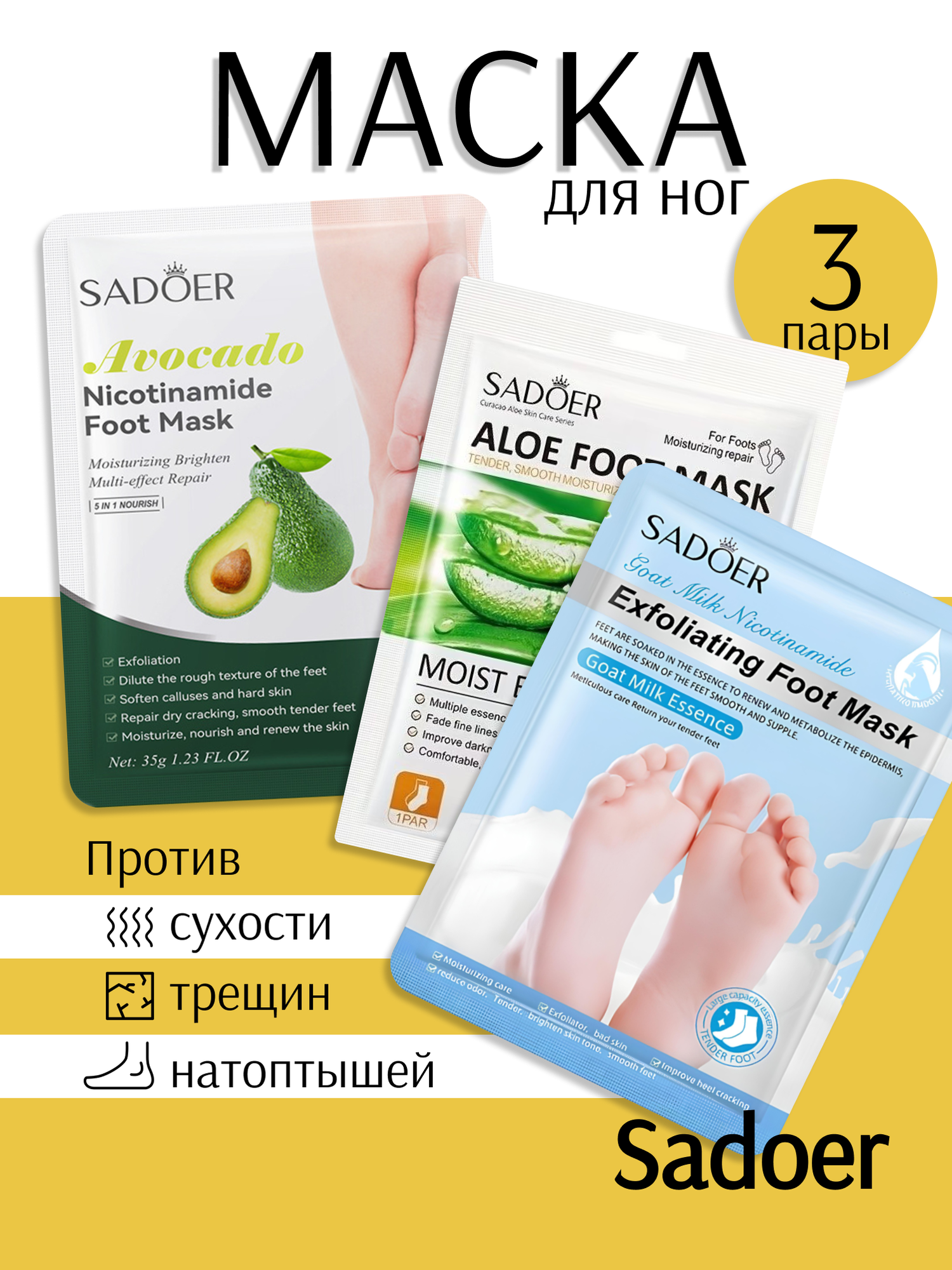 Маска для ног увлажняющая носочки для педикюра 3 пары / Увлажняющие носочки для ног Sadoer 3 пары интересное: