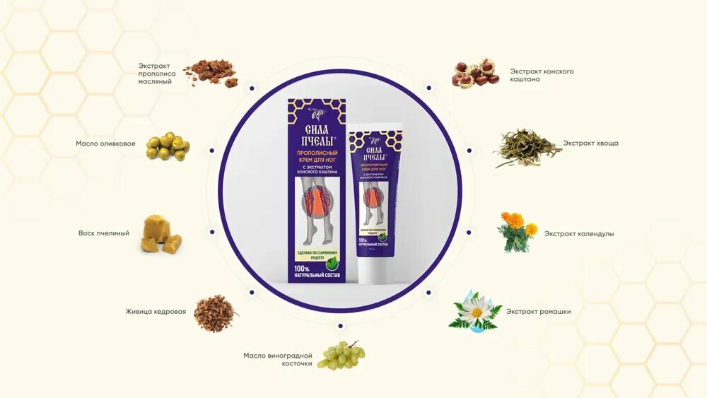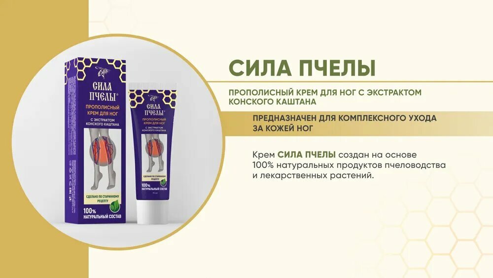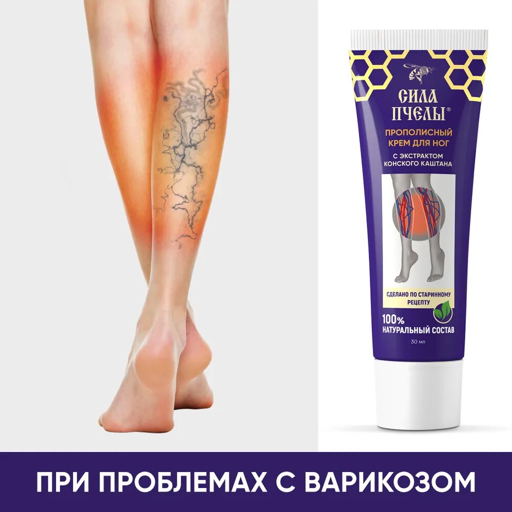 Купить Крем прополисный СИЛА ПЧЕЛЫ против варикоза, отеков, тяжести ног, экстракт конского каштана.