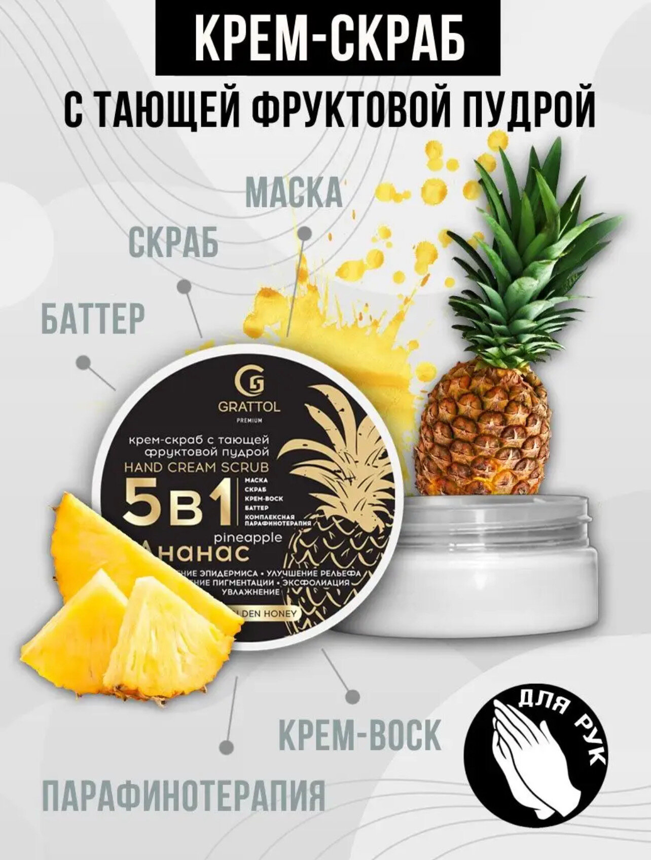 Grattol Premium Hand Cream Scrab Pineapple - Крем-скраб для рук, 5 в 1 с фруктовой пудрой, ананас, 50 мл интересное: