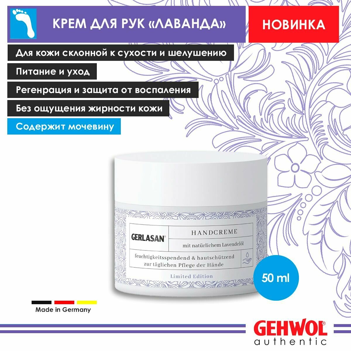 Крем для рук увлажняющий с мочевиной Gehwol Лаванда для сухой кожи склонной к шелушению с пудрой тапиоки без жирности 50 мл. интересное: