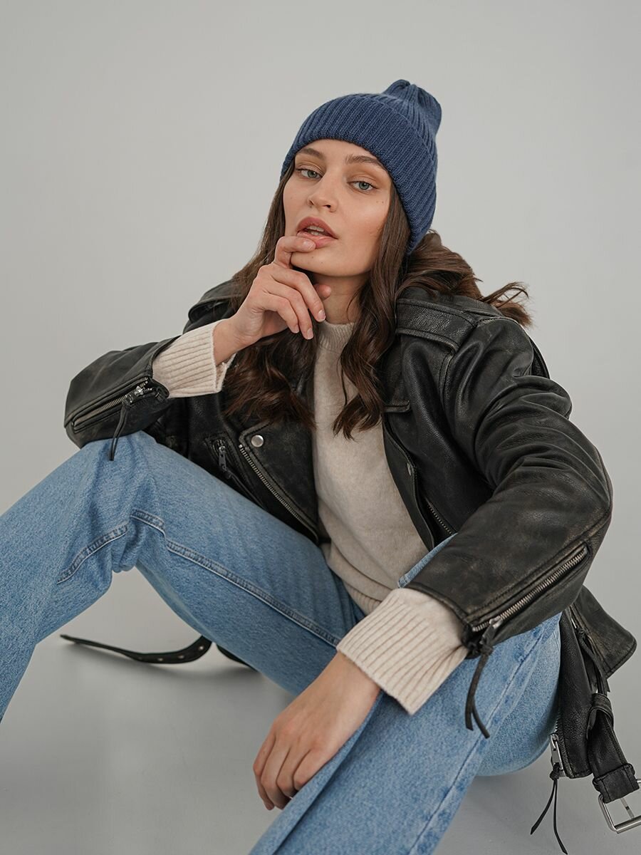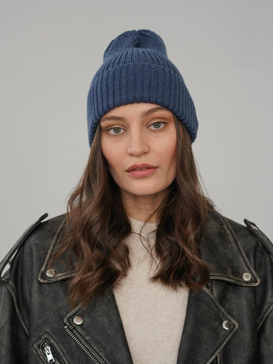 Шапка-бини JUMBI Шапка женская демисезонная зимняя вязаная с отворотом для взрослых и детей, размер 53-58, синий меланж интересное: