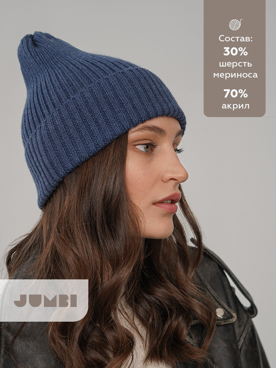Купить Шапка-бини JUMBI Шапка женская демисезонная зимняя вязаная с отворотом для взрослых и детей, размер 53-58, синий меланж