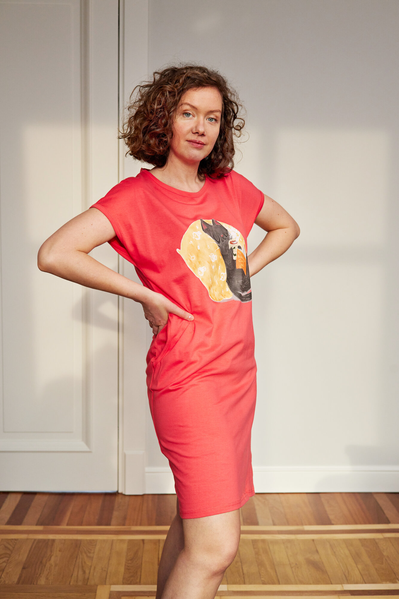 Женская платье-туника, с рукавом, вискоза, с карманами, цвет персиковый, бежевый. Размер 46