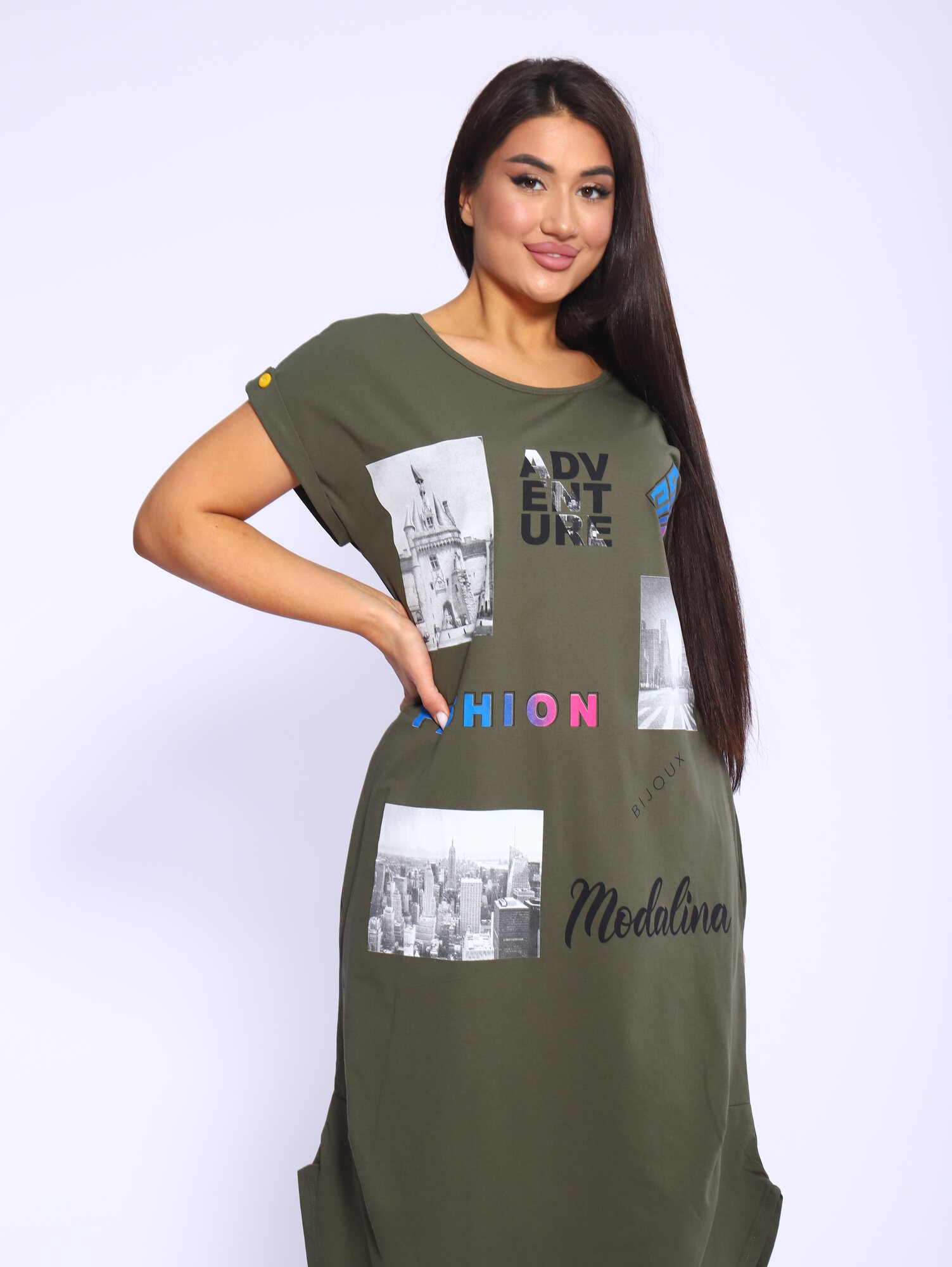 СохранитьПлатье MODALINA, размер 66, хаки интересное: