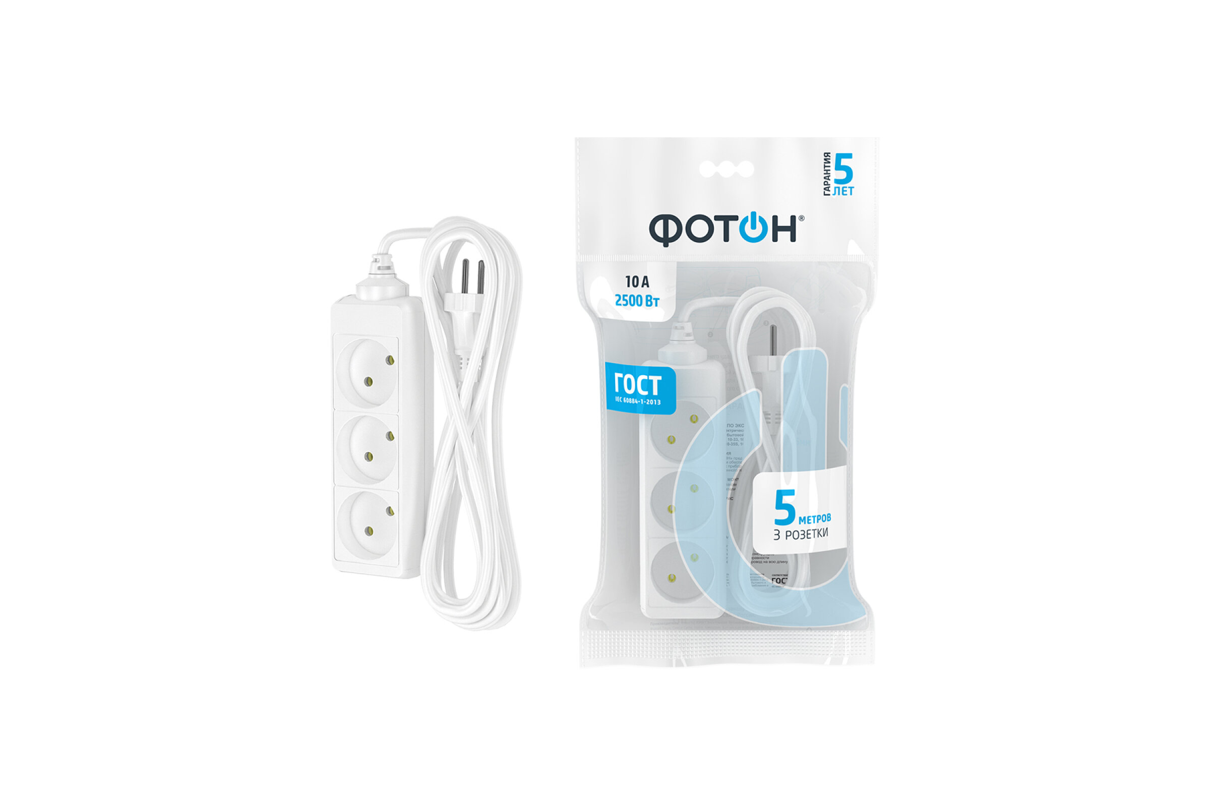 Удлинитель сетевой для розетки фотон 10А 5м 3 розетки белый, ГОСТ