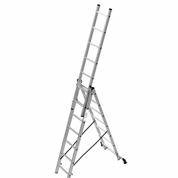 СохранитьЛестница-стремянка трехсекционная Новая высота NV 1230, алюминиевая, 3 x 7 ступеней, 2,67 - 5,09 м интересное: