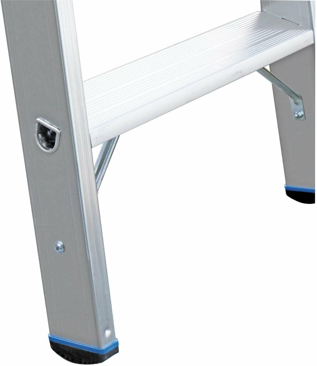 | Дополнительная информация | заменяемая полка для инструментов с крюком для ведра; опорная часть с прочными поперечными распорками; защитные верхние заглушки на опорной части лестницы исключают защемление при раздвижении стремянки |