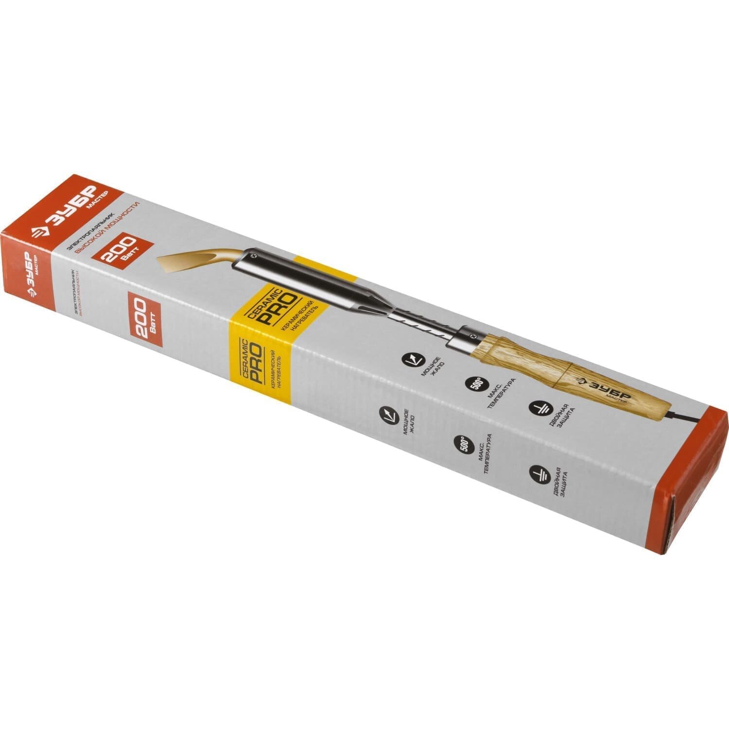 Высокомощный электропаяльник ЗУБР 200Вт с деревянной рукояткой, клин, Ceramic PRO
