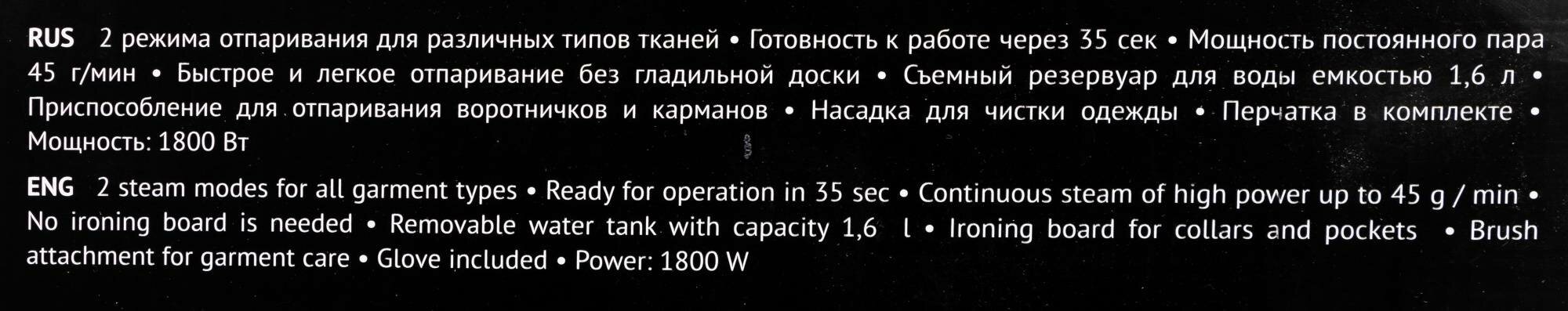 | Минусы: | Обычный отпариватель только в красивой упаковке , утюг не заменит ! |