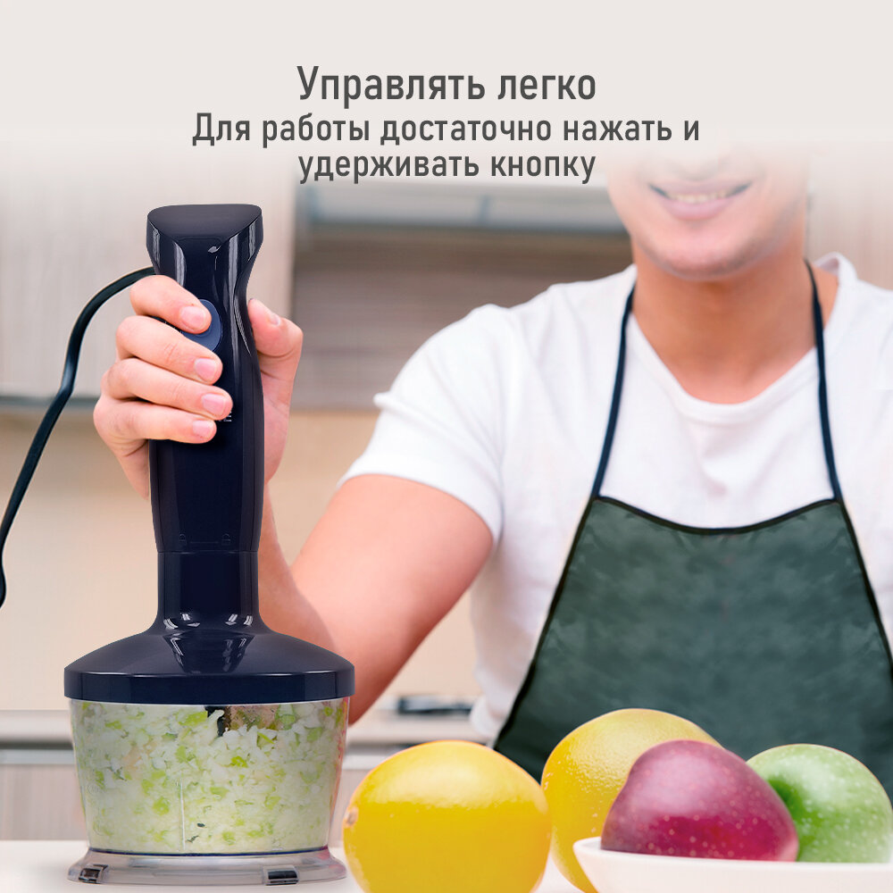 Хороший блендер с венчиком для взбивания и измельчителем. Емкость для измельчителя 600 грамм, по типу блендер погружной. Пластик корпуса не пахнет, а погружная часть металлическая. Кнопка включения не нажимается от легко качания, придерживать ее при работе тоже не сложно.