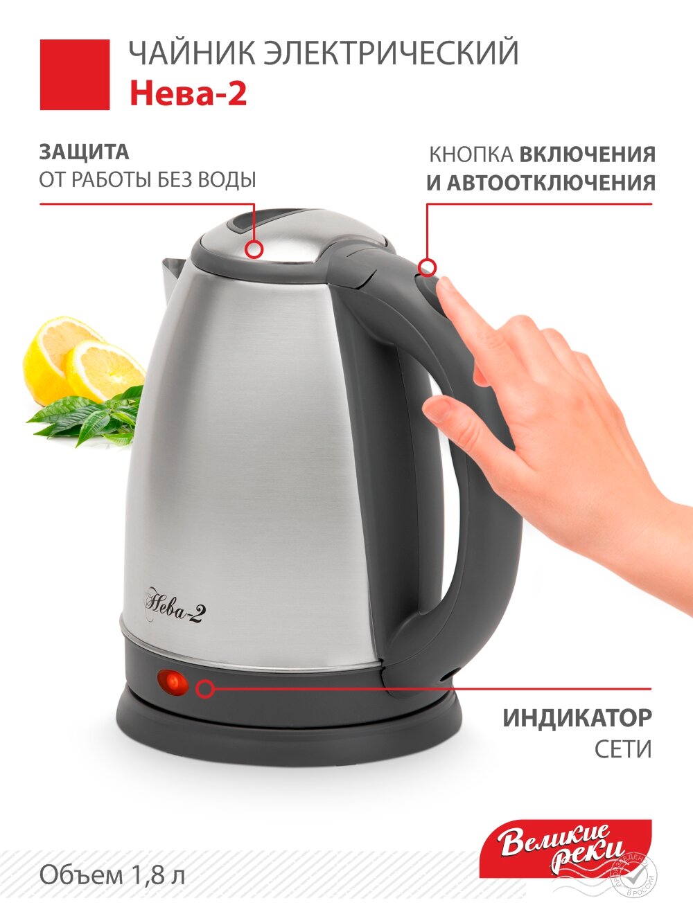 Чайник электрический Великие Реки Нева-2, нерж. сталь в сером пластике, 1500 Вт, 1.8 л, металл крышки внутри и снаружи, двойной контроллер