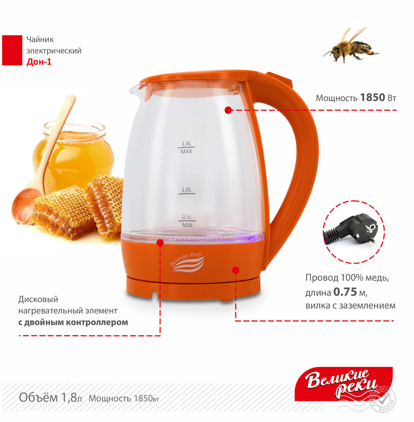 Чайник электрический Великие Реки Дон-1 оранжевый, 1,8 л, стекло, 1850 Вт