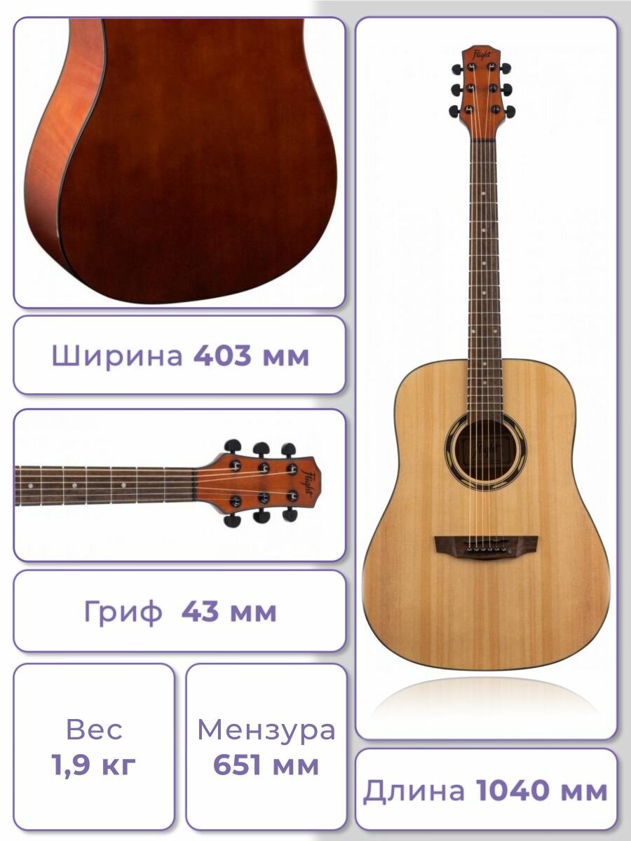Ниже Вы можете прочитать отзывы на Акустическая гитара Flight D-130 NA, ознакомится с подробными характеристиками, посмотреть интересные обзоры и фотографии на Акустическая гитара Flight D-130 NA.